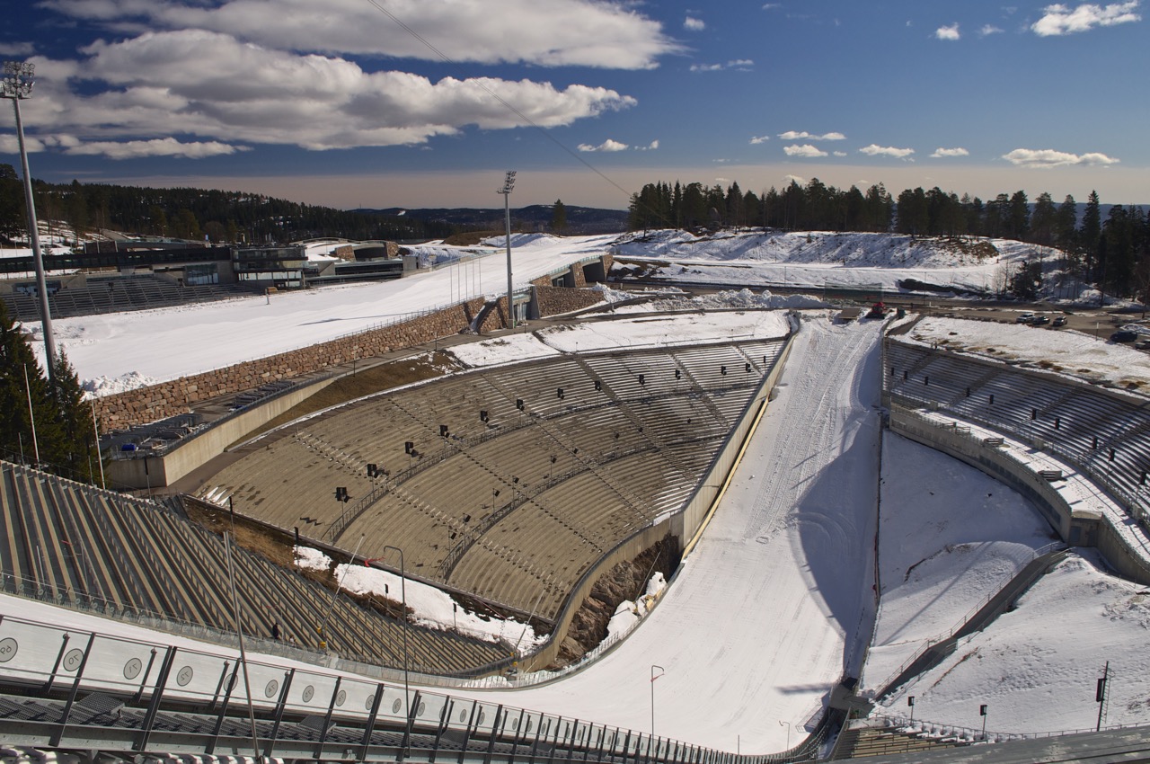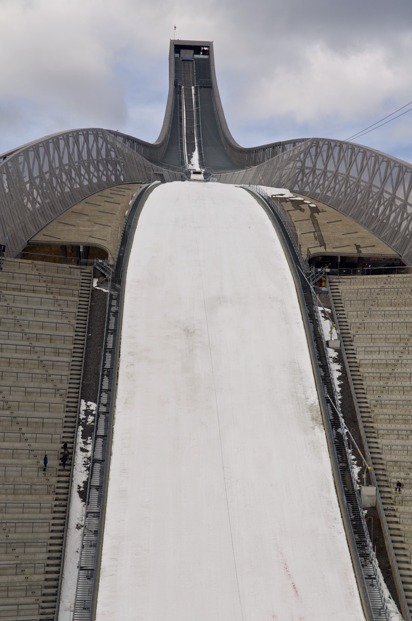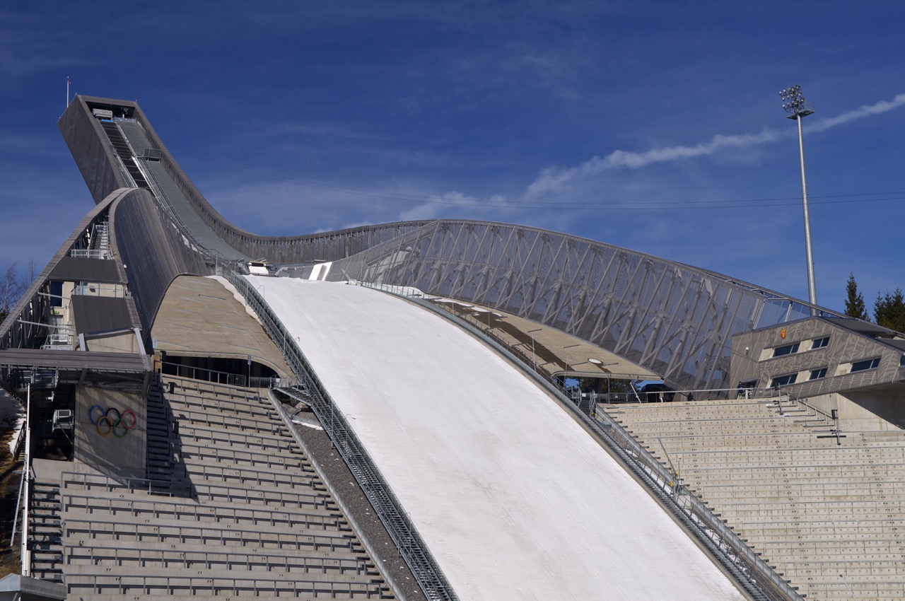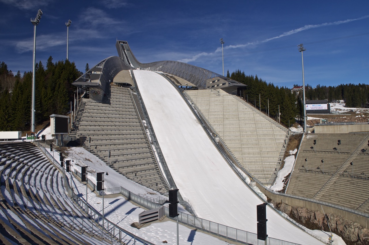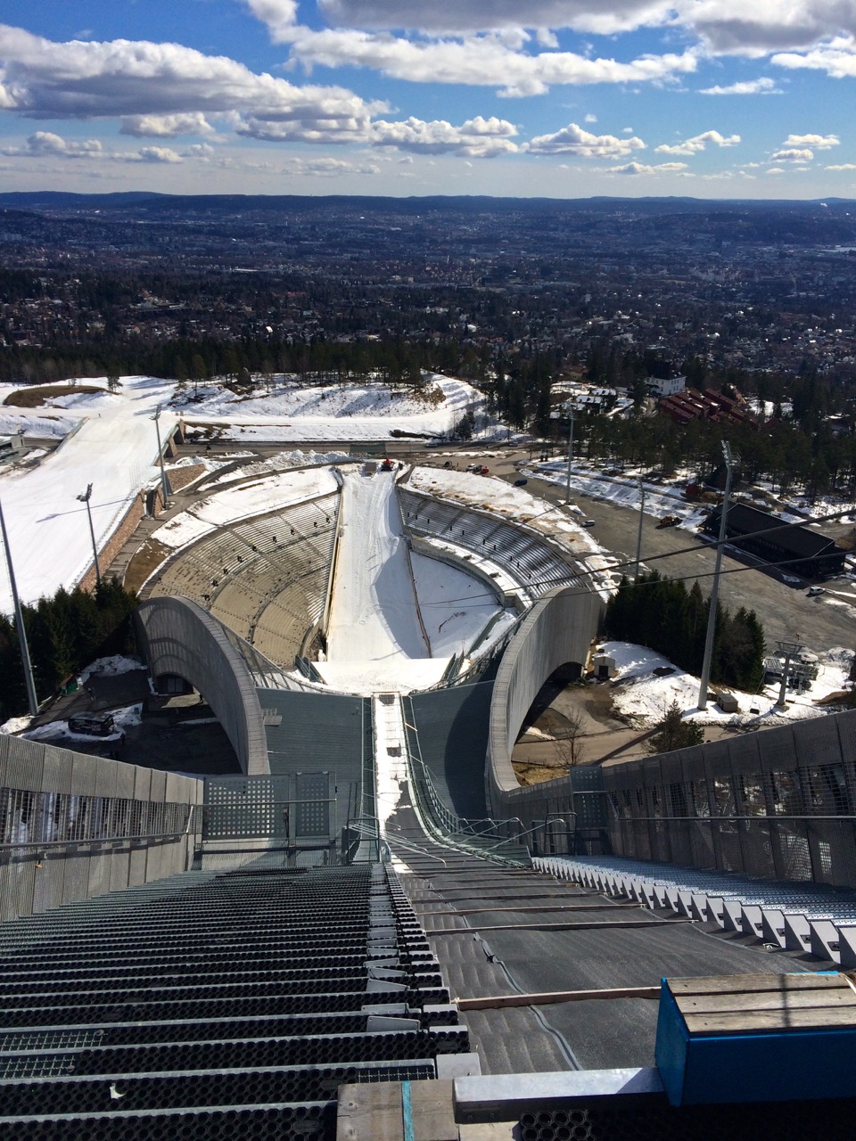 Neulich haben wir gelesen, dass Skispringer beim Sprung genauso viel Stress empfinden, wie jemand in Lebensgefahr. Heute ging es für uns auf den Holmenkollen und natürlich auch auf den Holmenkollbakken, der ältesten und wahrscheinlich bekanntesten Skisprungschanze der Welt. Und dort konnten wir uns davon überzeugen, dass für einen Normalmenschen schon das Runterschauen ausreicht, um ordentlich Respekt zu haben. Anlauf und Aufsprungbahn sind so steil, dass selbst viele gute Skifahrer mit normalen Abfahrtskiern wohl lieber eine weniger steile Piste außen rum bevorzugen würden.