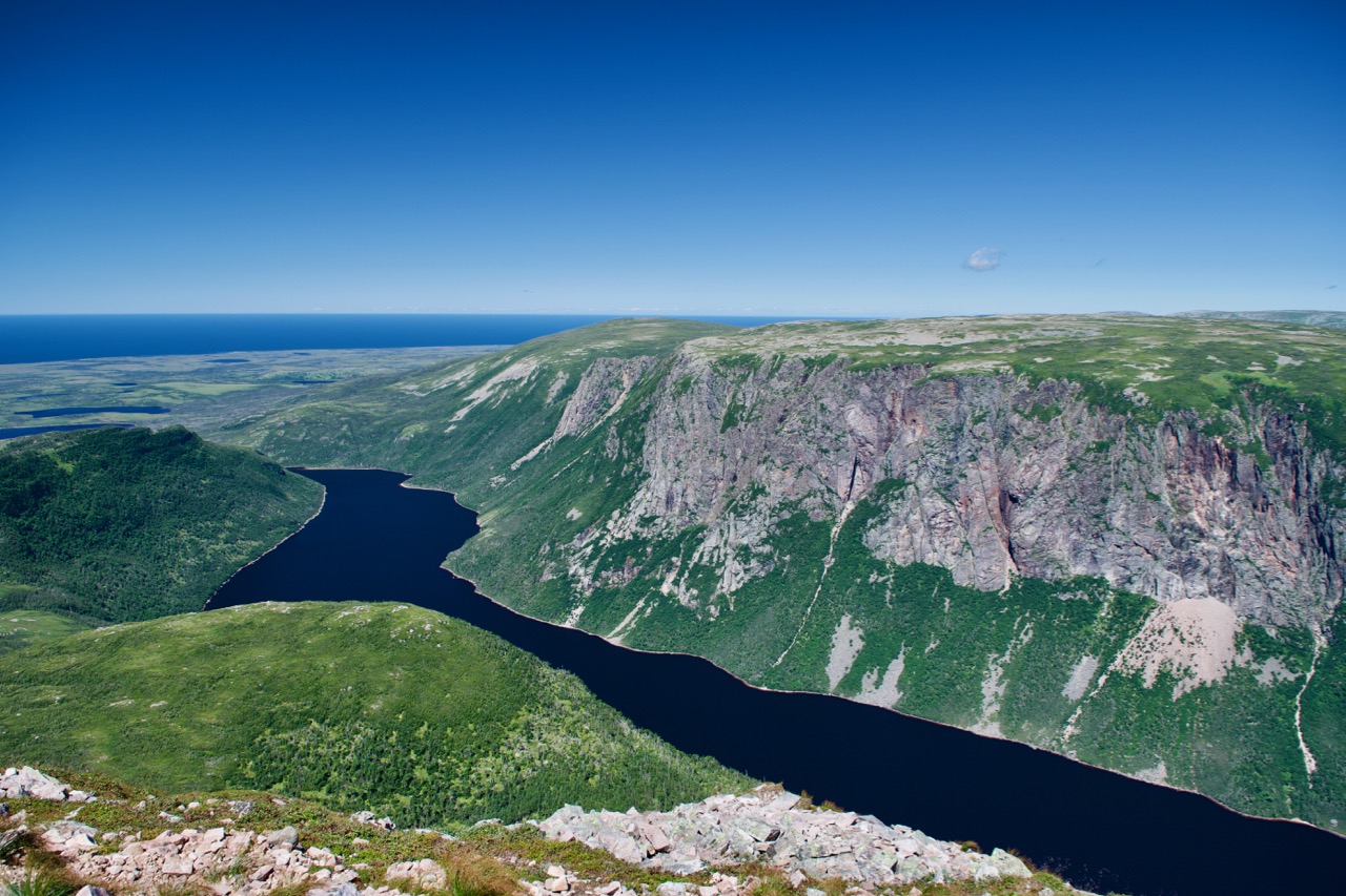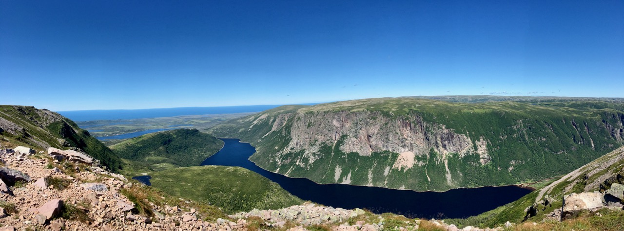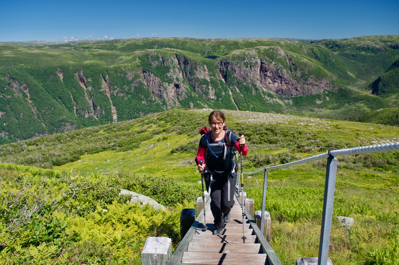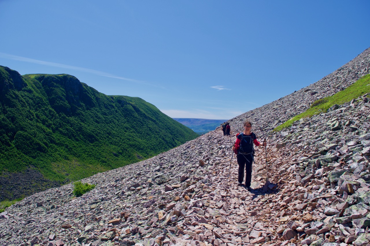 Der Gros Morne Mountain (s. erstes Foto unten) ist mit 806 m der höchste Berg des Gros-Morne-Nationalparks und der zweithöchste Neufundlands. Die Höhe ist aber nicht die Herausforderung der 16 km/6-8 Stunden-Tour, sondern vielmehr die Tatsache, dass es ewig lang extrem steil eine Geröllrinne hinauf ging. Dazu brannte die Sonne, aber wir haben wieder großartige Aussichten genießen können.