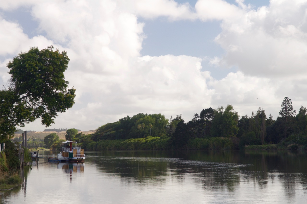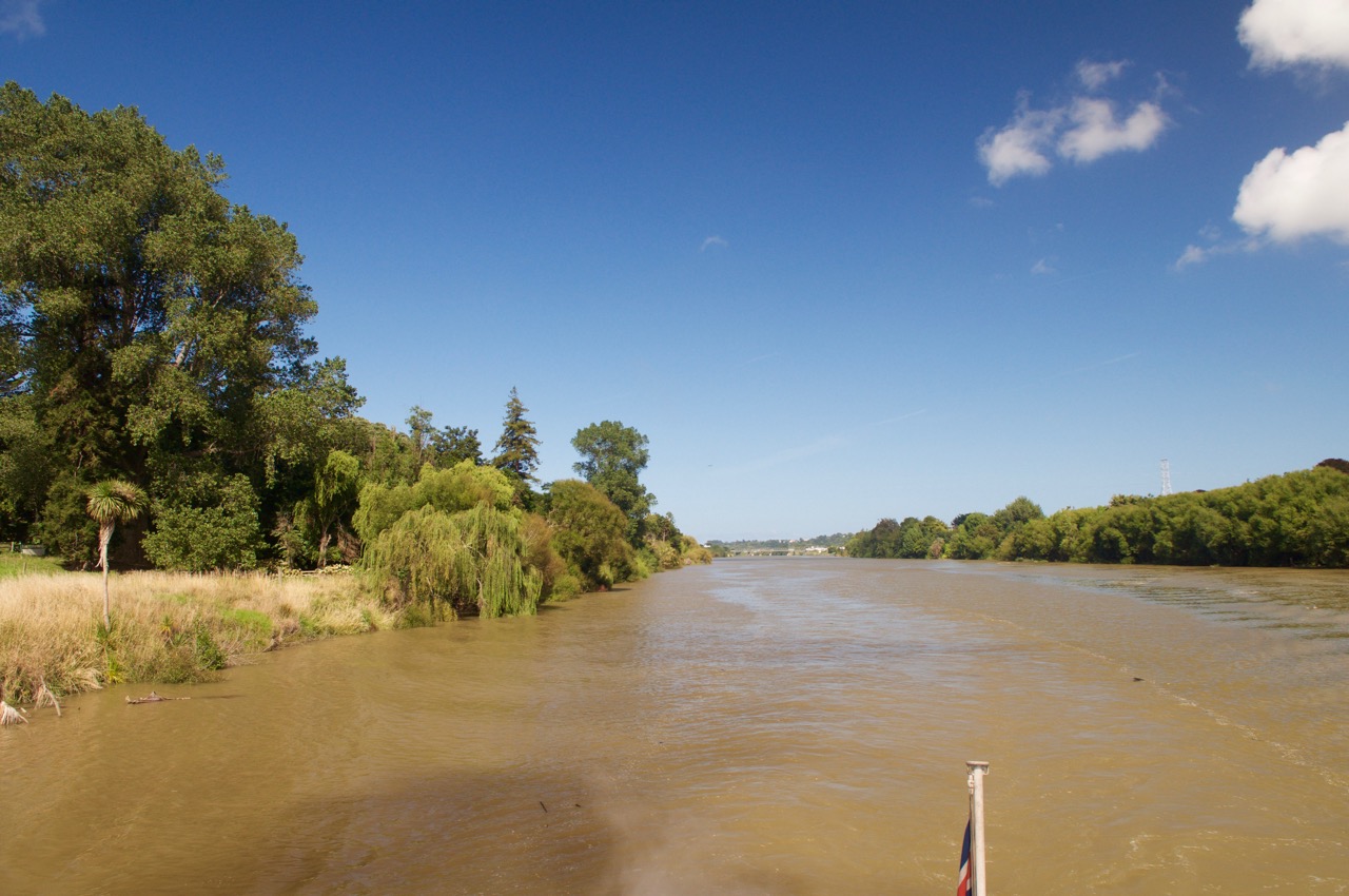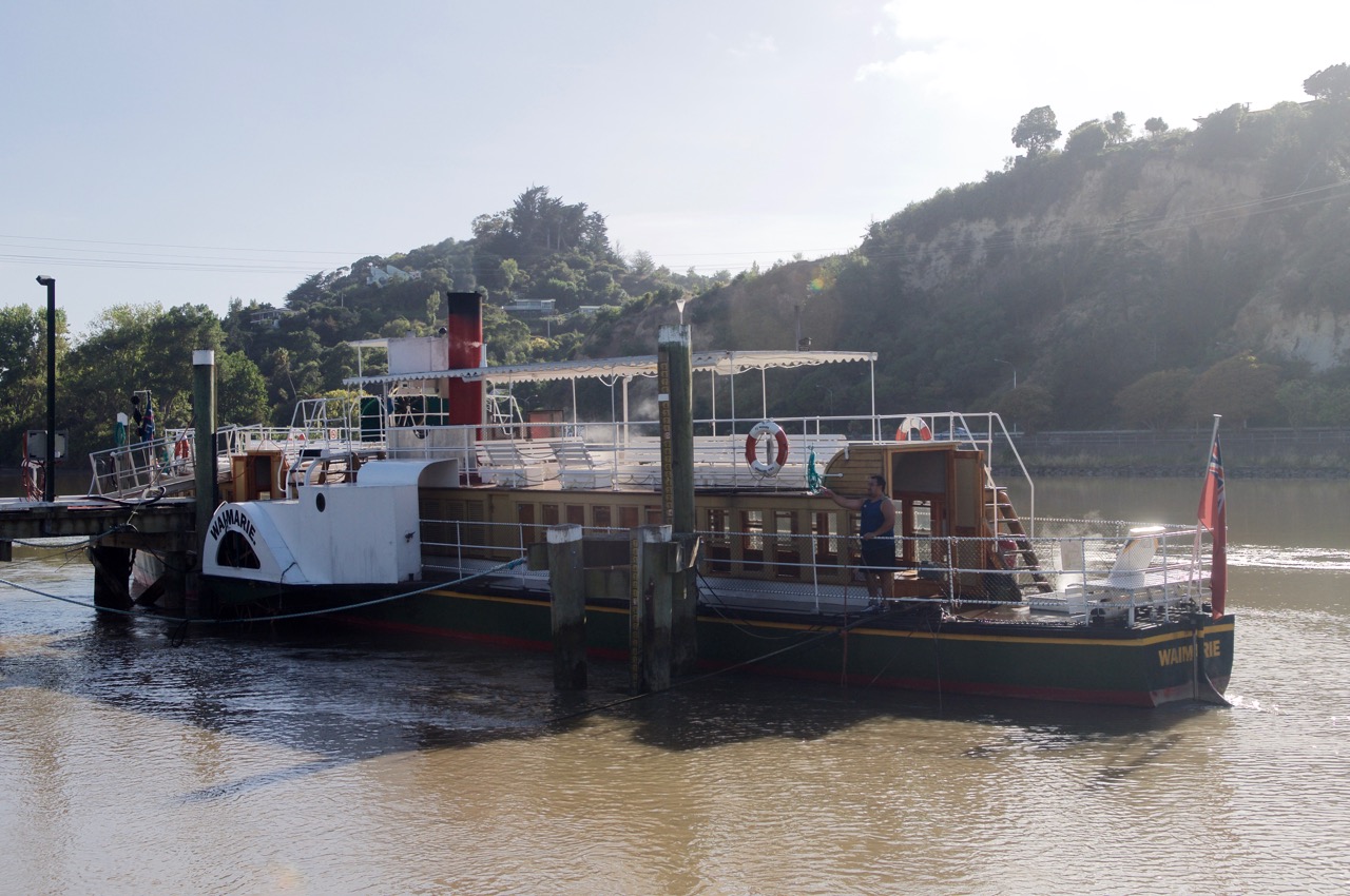 Nach all den Rafting-, Jetboat- und Kletter-Touren gab es heute eine gemütliche Fahrt mit dem einzigen erhaltenen Schaufelraddampfer, der 106 Jahre alten Waimarie, auf dem Whanganui River. Vor Fertigstellung der Straßenverbindung zwischen Auckland und Wellington war der Whanganui ein Teil dieser wichtigen Handelsroute, verlor diese Bedeutung dann aber schlagartig und wird heute hauptsächlich von Kajakfahrern geschätzt.