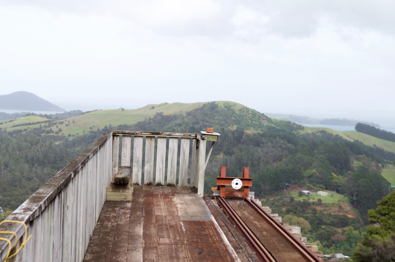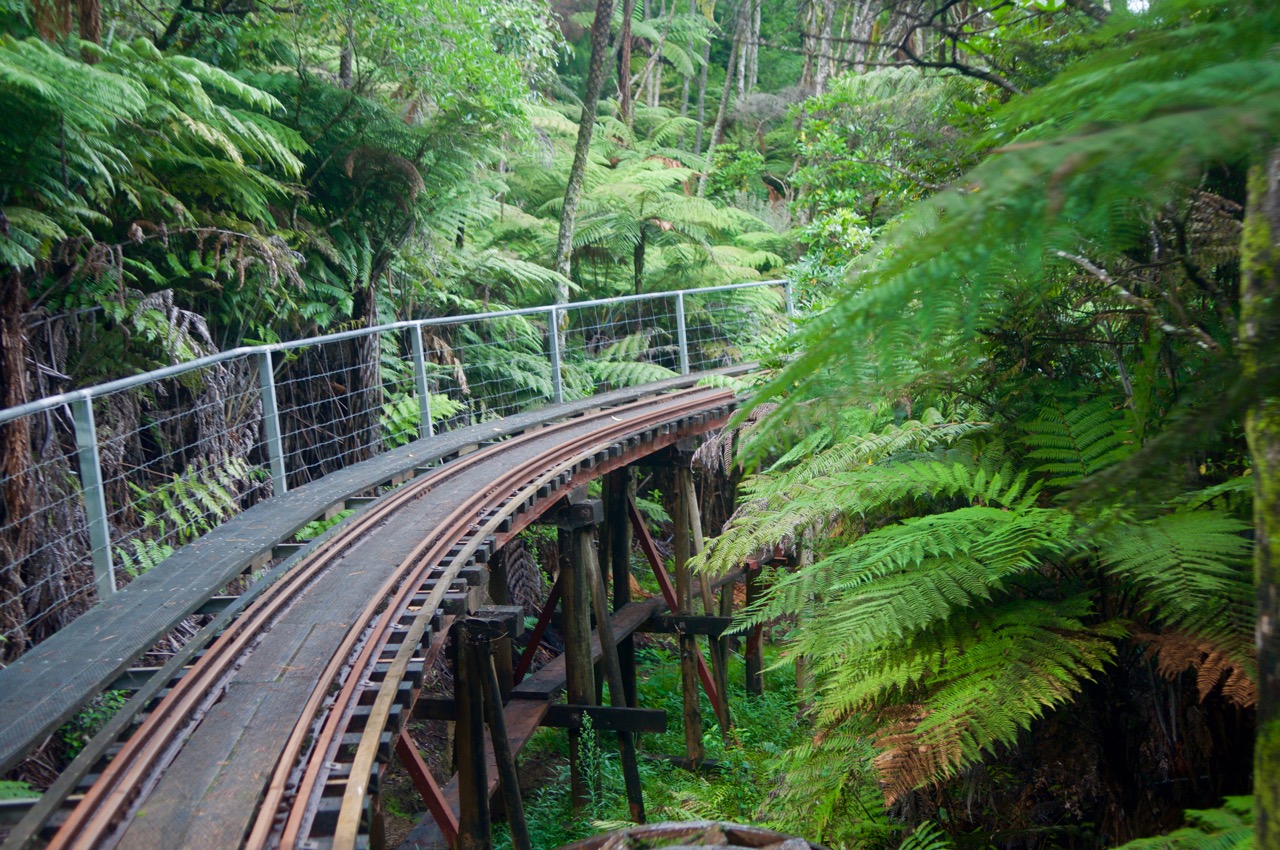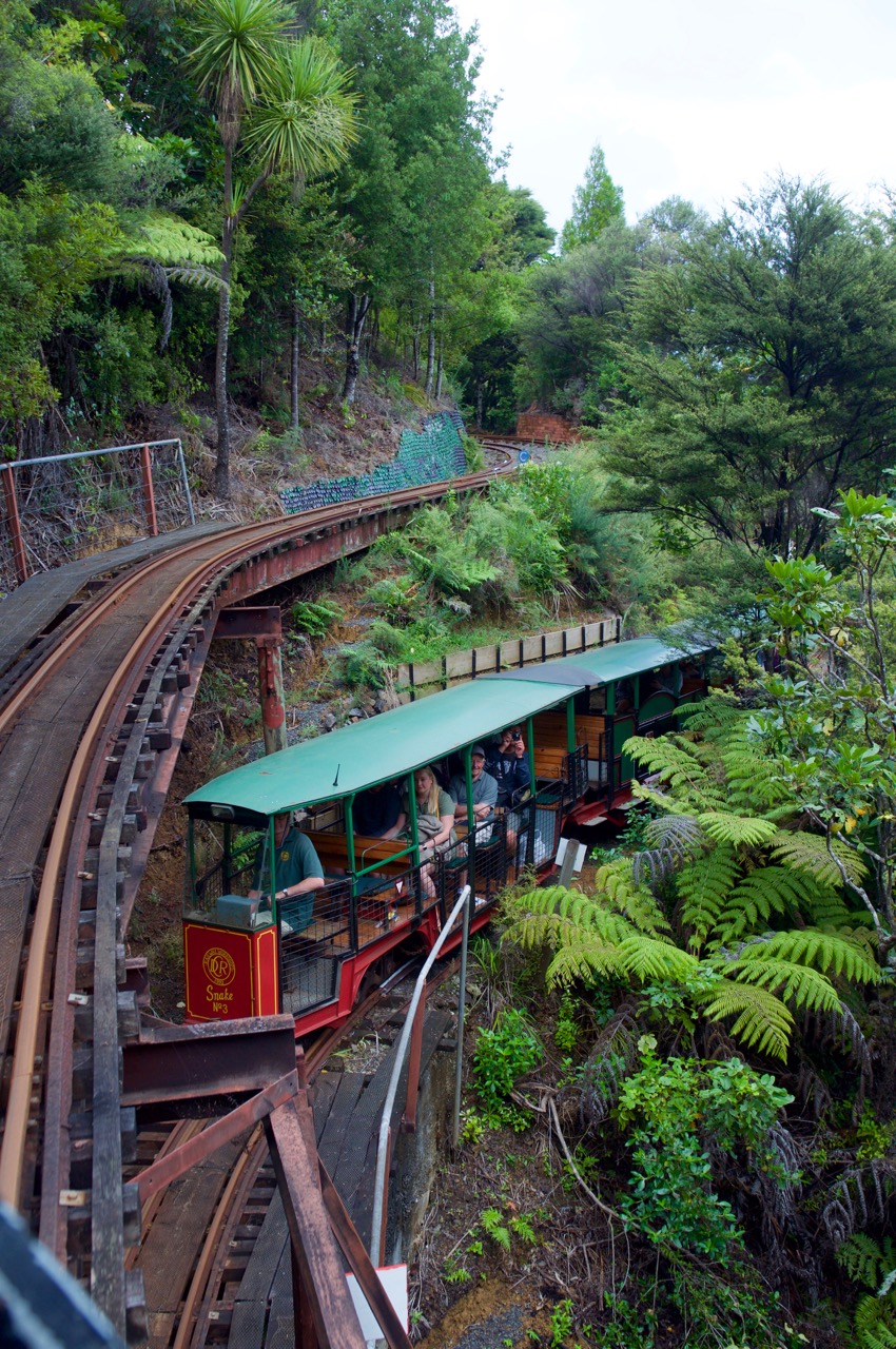 Heute Vormittag erklommen wir mit der Driving Creek Railway die Berge oberhalb von Coromandel Town. Es handelt sich um eine typische Busch-Bahn mit einer Spurbreite von gerade einmal 15 Zoll (381 mm). Diese Bergbahn wurde ursprünglich für den Transport gefällter Bäume aus den Bergen gebaut. Da sich dies alleine nicht rechnete, wird sie seit 1990 auch für Ausflugsfahrten genutzt. Die Streckenführung ist wegen des großen Höhenunterschieds teilweise abenteuerlich, so dass schon das Herausschauen Mut erfordert. Mehrfach fährt der Zug (wie auf manchen Strecken in Peru) zickzackförmig hin und her in die Höhe. Das vierte Foto unten zeigt eine Wendestelle, die ziemlich weit über den Abgrund hinausragt und auf dem fünften Foto kann man die Aussicht von oben bewundern.
