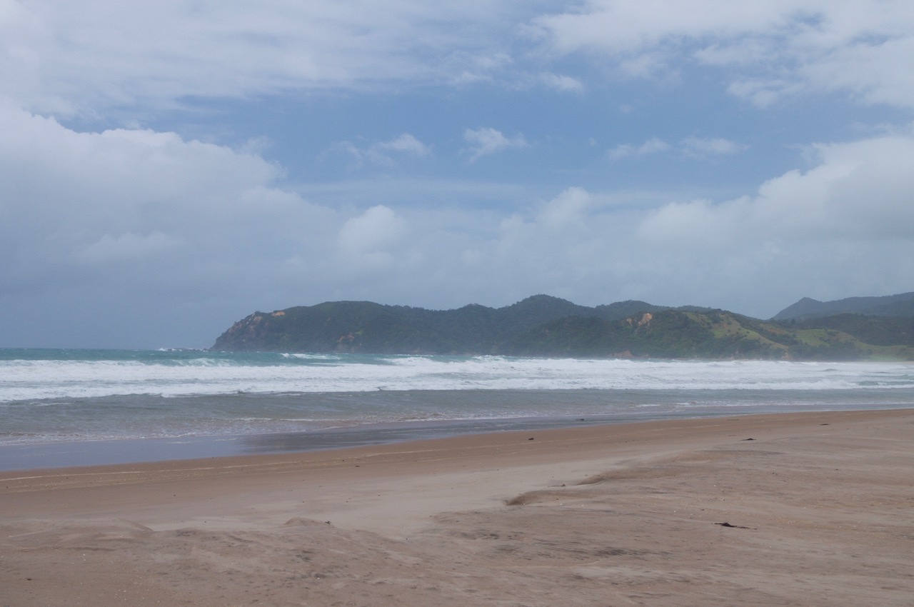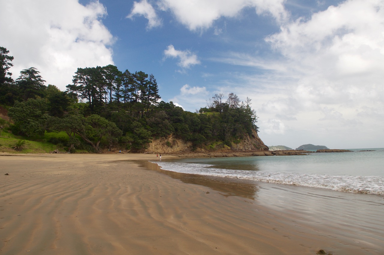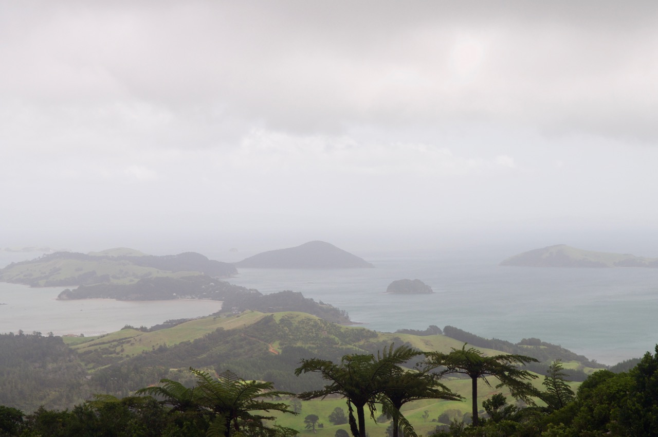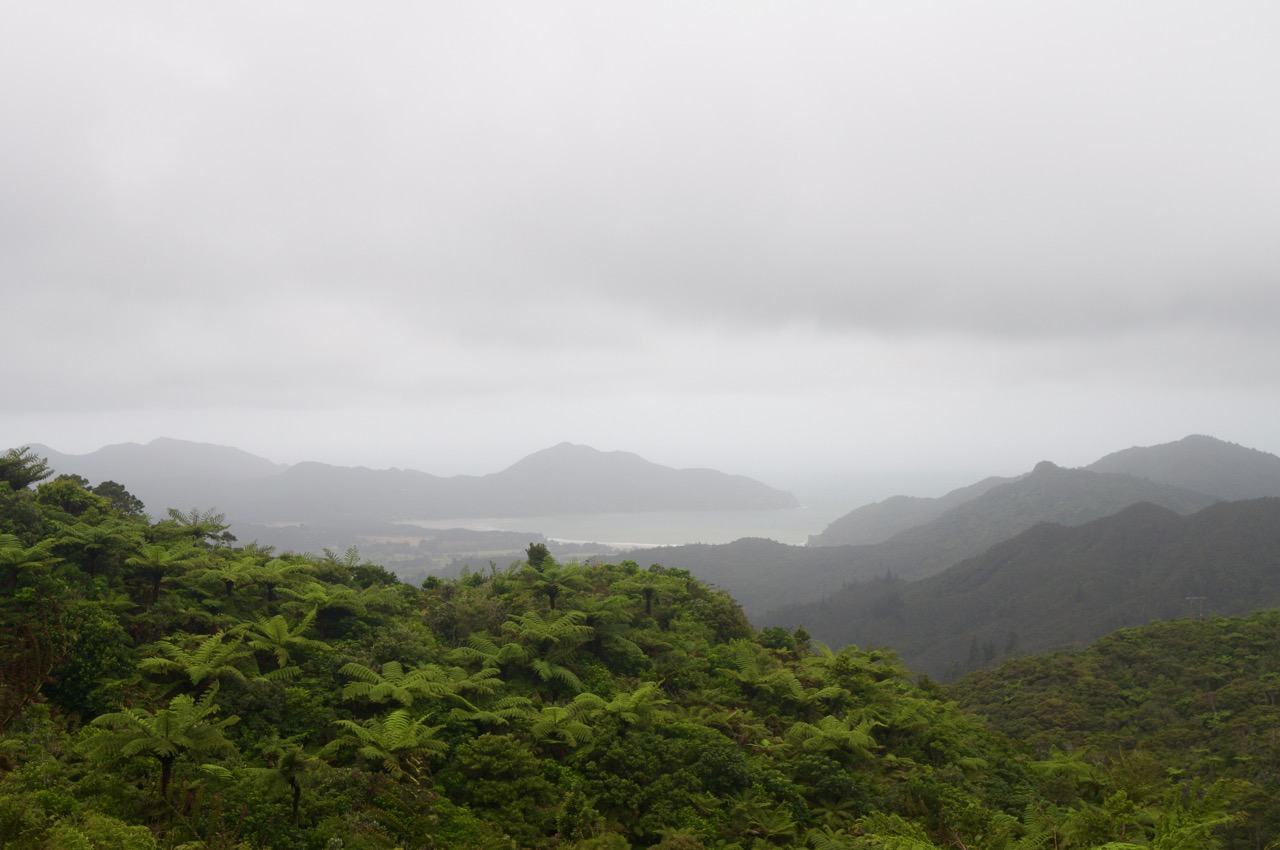 Die zweite Tageshälfte fuhren wir dann die schönsten Strände der nördlichen Coromandel ab. Gestartet sind wir von Coromandel Town an der Westküste nach Norden, dann rüber an die Ostküste und dort nach Süden und zurück zu unserem Quartier in Coromandel Town. Man darf dazu wissen, dass die Coromandel-Halbinsel maximal 40 km breit ist und dabei auf 900 m ansteigt. Bei Coromandel Town ist sie sogar nur weniger als 10 km breit. Und auch wenn die Straße natürlich nicht über den höchsten Gipfel führt, sondern der Pass an dieser schmalen Stelle "nur" auf 420 m Höhe liegt, könnt Ihr Euch vorstellen, dass die Straße und auch die fahrerischen Anforderungen (steile, geschotterte, häufig einspurige Serpentinen-Straße am Hang entlang – wie in Neuseeland üblich, häufig nicht oder kaum gegen Abstürzen gesichert) ziemlich anspruchsvoll sind. Die letzten beiden Fotos zeigen dann auch keine Strände mehr, sondern die Aussicht von der höchsten Stelle in entgegengesetzte Richtungen mit dem Meer auf beiden Seiten.