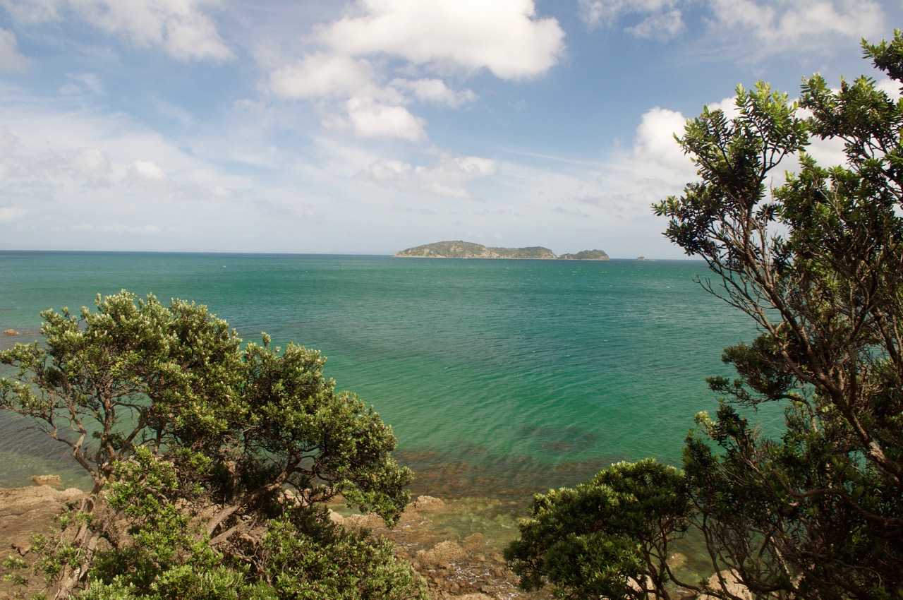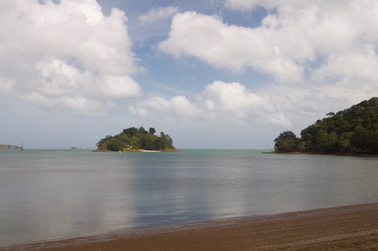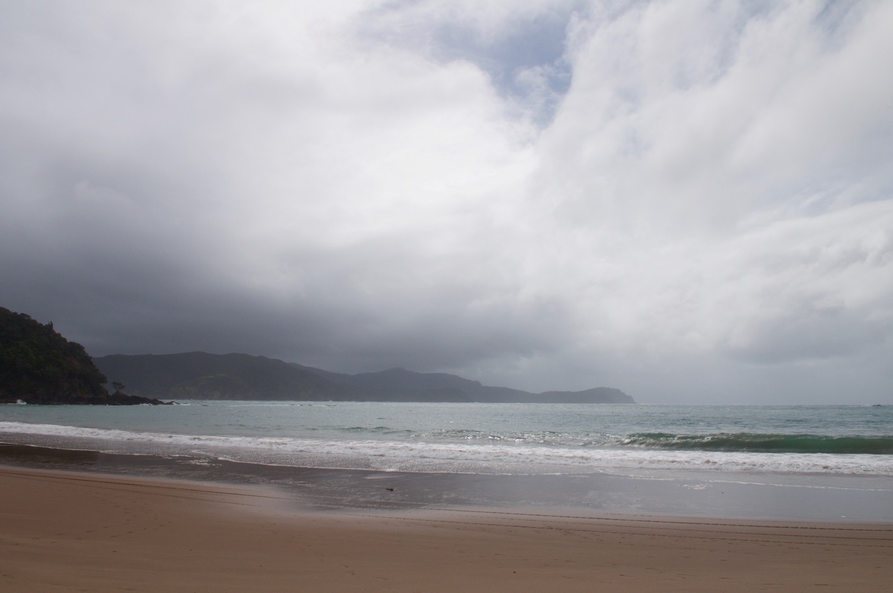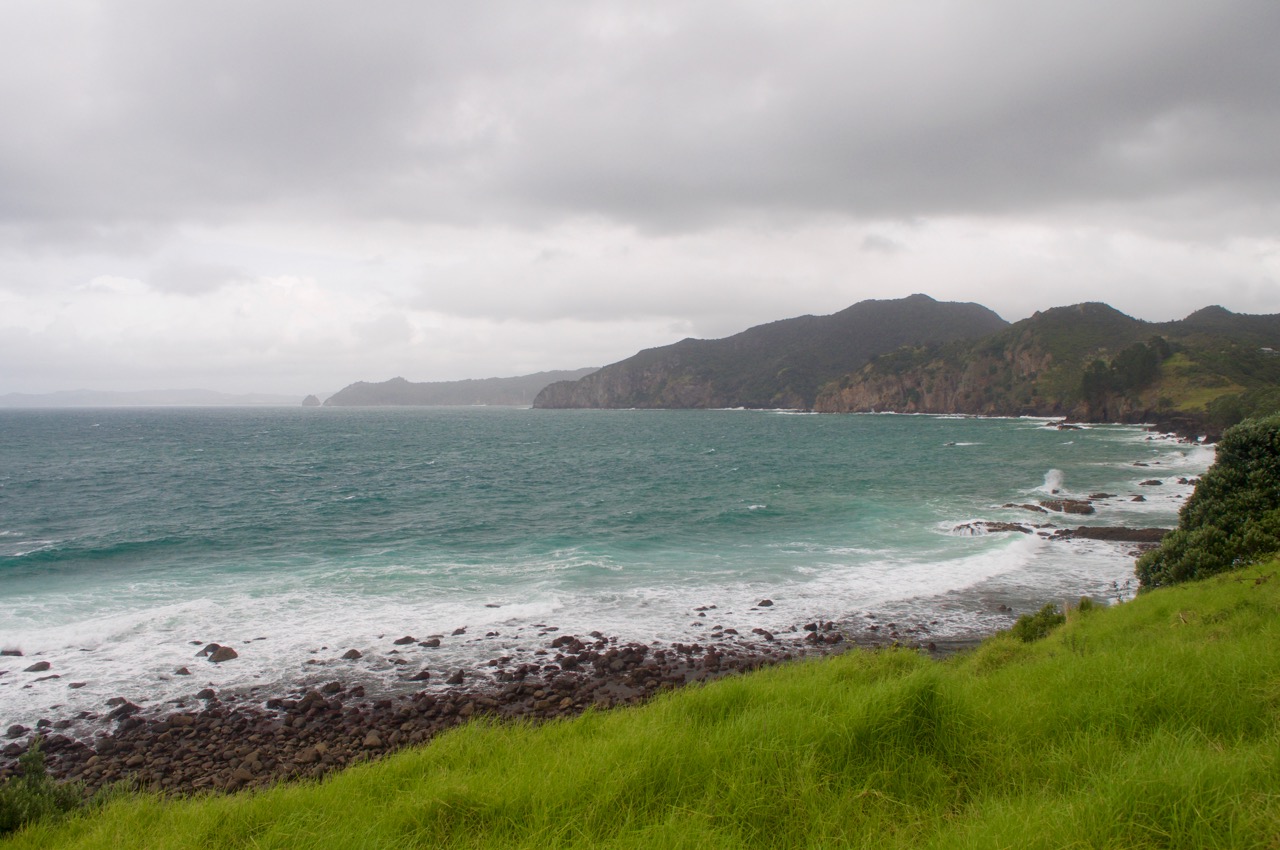 Die zweite Tageshälfte fuhren wir dann die schönsten Strände der nördlichen Coromandel ab. Gestartet sind wir von Coromandel Town an der Westküste nach Norden, dann rüber an die Ostküste und dort nach Süden und zurück zu unserem Quartier in Coromandel Town. Man darf dazu wissen, dass die Coromandel-Halbinsel maximal 40 km breit ist und dabei auf 900 m ansteigt. Bei Coromandel Town ist sie sogar nur weniger als 10 km breit. Und auch wenn die Straße natürlich nicht über den höchsten Gipfel führt, sondern der Pass an dieser schmalen Stelle "nur" auf 420 m Höhe liegt, könnt Ihr Euch vorstellen, dass die Straße und auch die fahrerischen Anforderungen (steile, geschotterte, häufig einspurige Serpentinen-Straße am Hang entlang – wie in Neuseeland üblich, häufig nicht oder kaum gegen Abstürzen gesichert) ziemlich anspruchsvoll sind. Die letzten beiden Fotos zeigen dann auch keine Strände mehr, sondern die Aussicht von der höchsten Stelle in entgegengesetzte Richtungen mit dem Meer auf beiden Seiten.