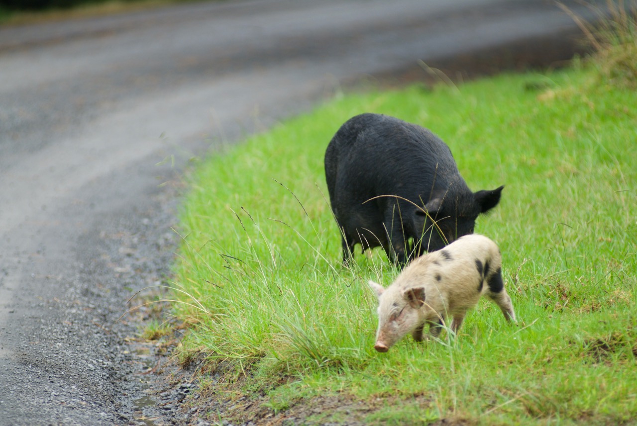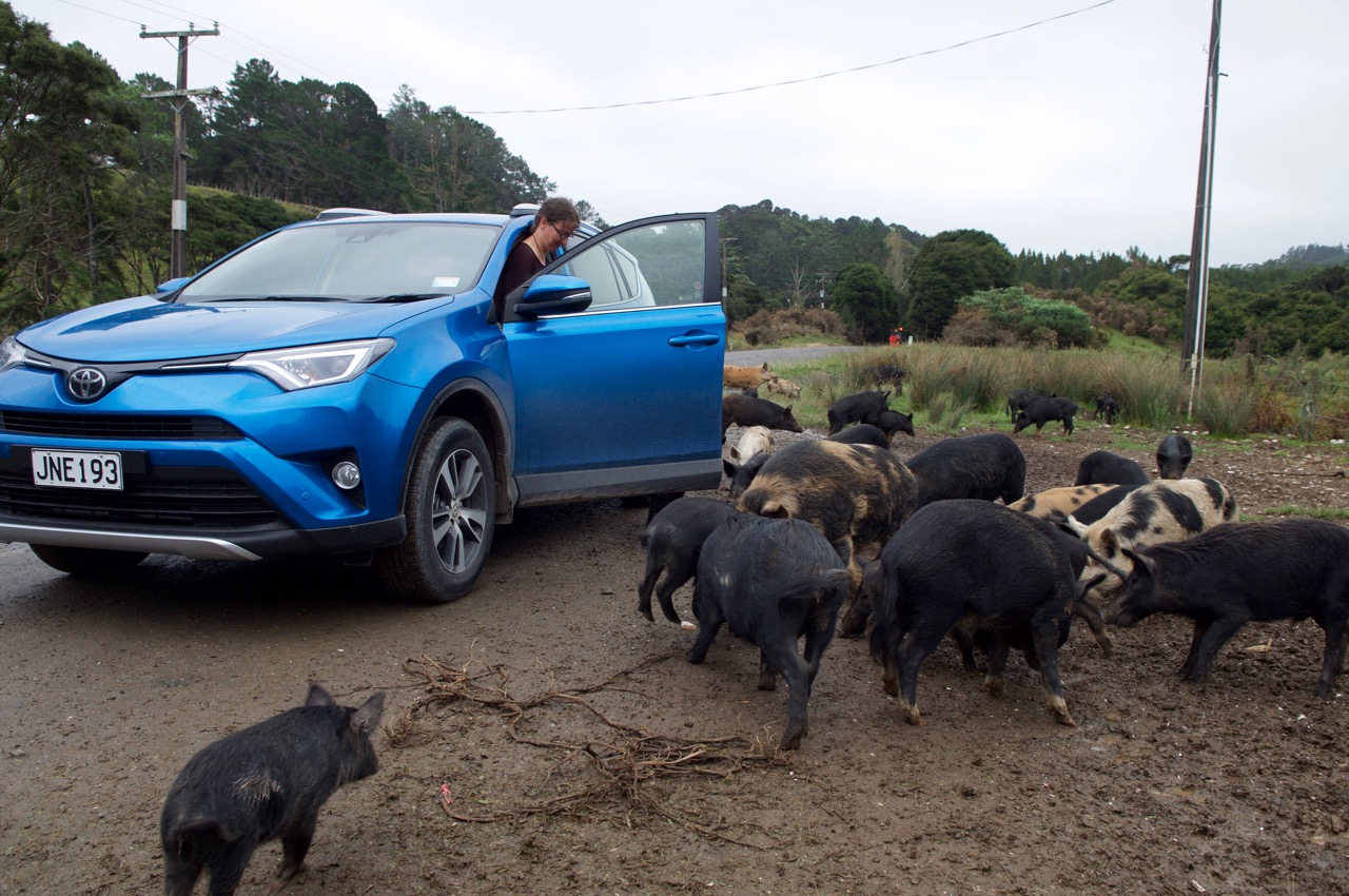 Heute ging es eine relativ kurze Strecke etwas nach Südosten in die Mitte der Coromandel zu den Rapaura Watergardens. Auf dem Weg dorthin waren Kauris eines unserer Ziele, doch da Kauris hochformatig sind und sich als Titelfoto ein Querformat besser eignet, hatten wir die Wahl zwischen einem Wasserfall (da habt Ihr schon viele in den letzten Wochen gesehen) und den wilden Schweinen an der Road 309.