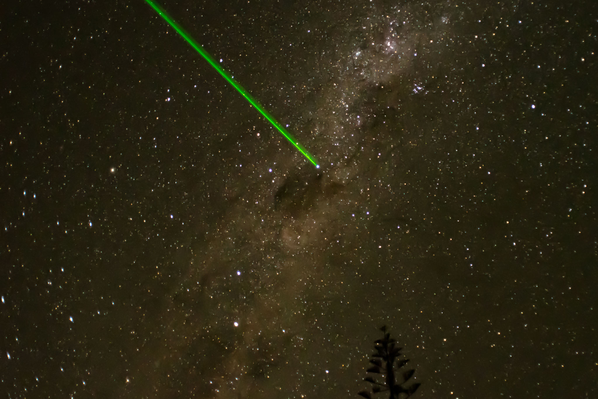 - Foto 4: Milchstraße – Laserpointer zeigt auf den Stern Acrux im Kreuz des Südens