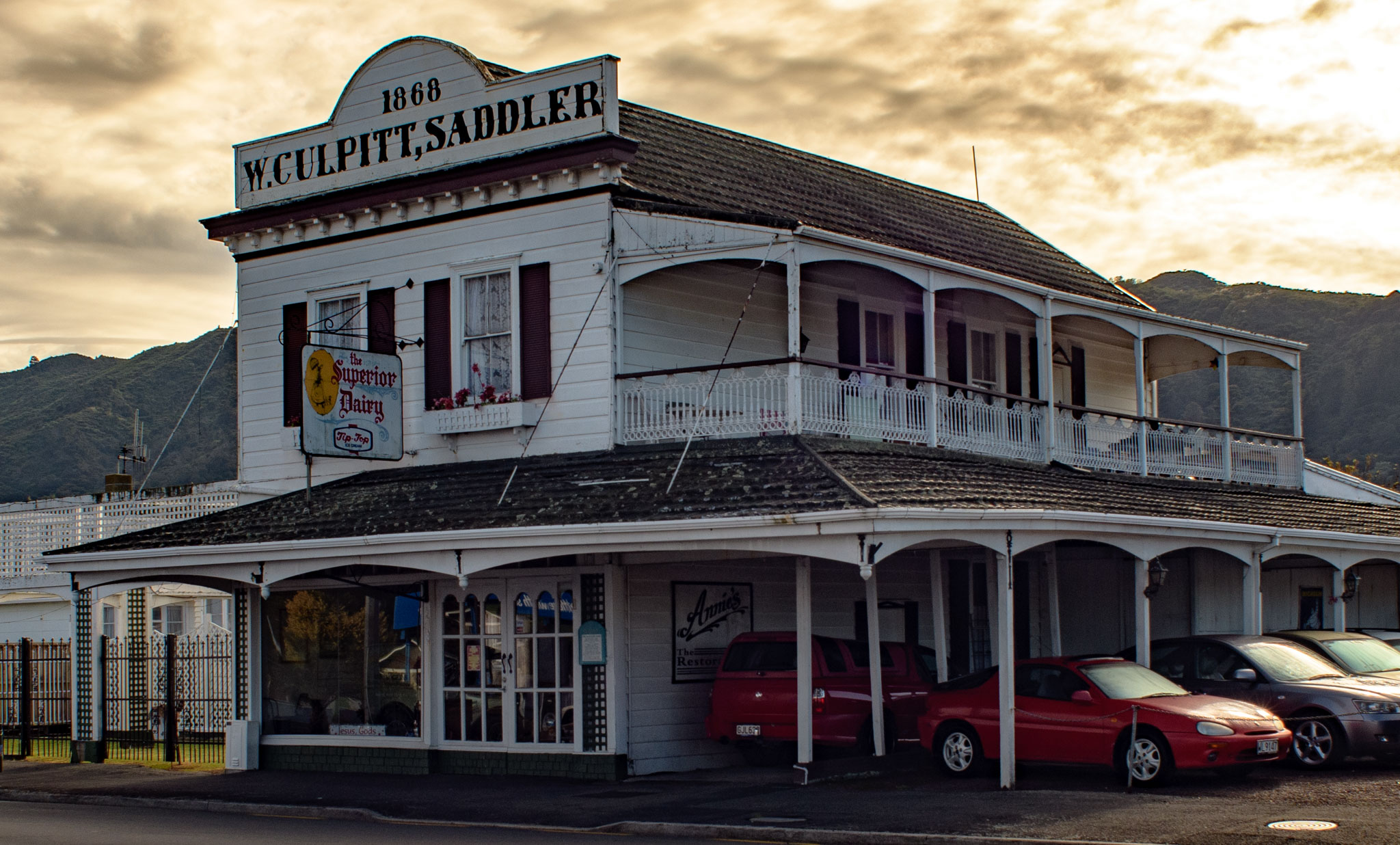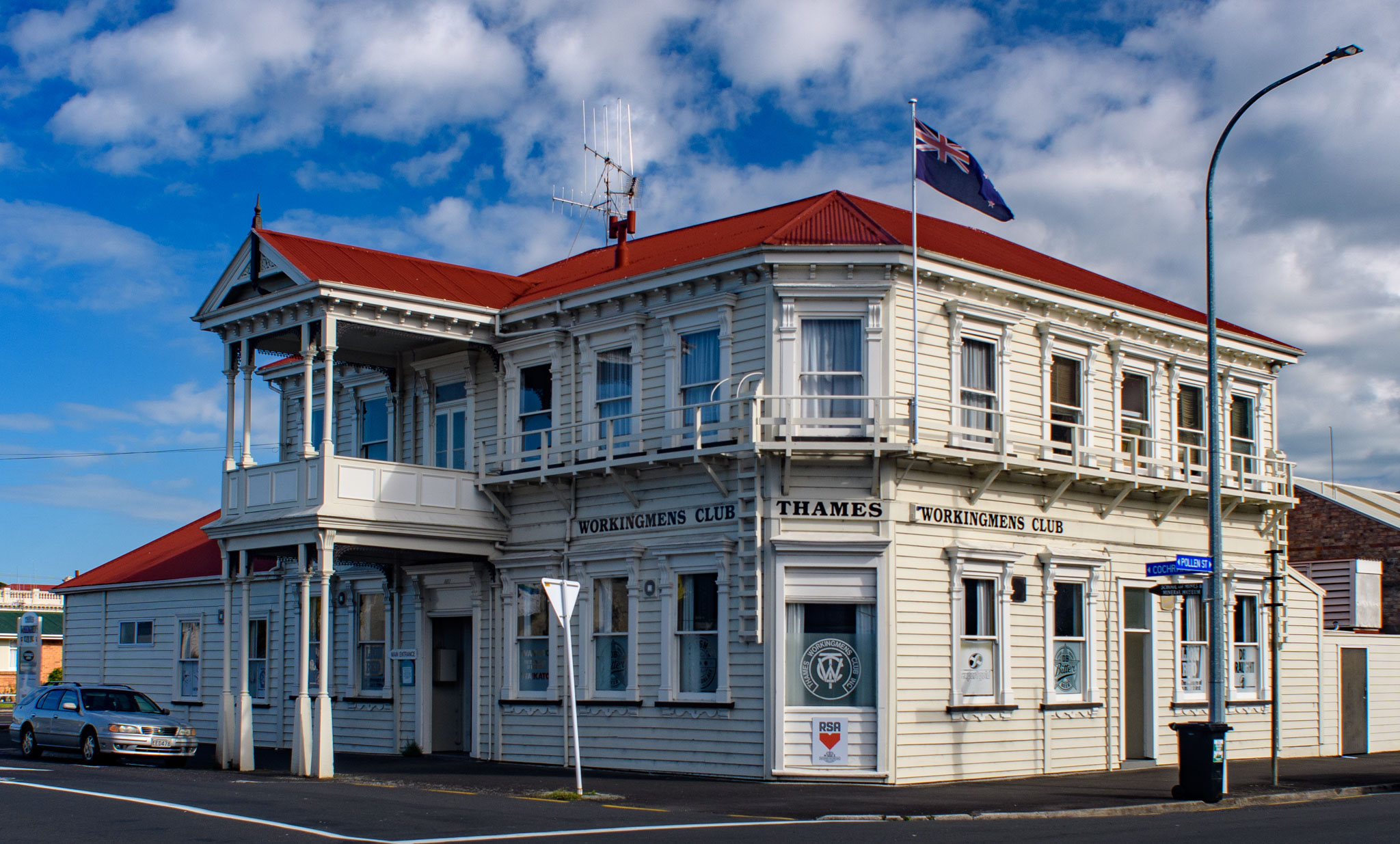 Bisher war Thames, am südwestlichen Ende der Coromandel-Halbinsel gelegen, für uns eine nicht sonderlich attraktive Kleinstadt. Die letzten zwei Tage haben wir dort lediglich übernachtet, weil sie der bestmögliche Startpunkt für unsere gestrige Pinnacles-Tour war. Von den Hosts in unserem B&B wurden wir allerdings darauf aufmerksam gemacht, dass Thames eine ganze Reihe von schönen und (für neuseeländische Verhältnisse) historischen Gebäuden zu bieten hat, die auch regelmäßig für Filmaufnahmen genutzt werden.