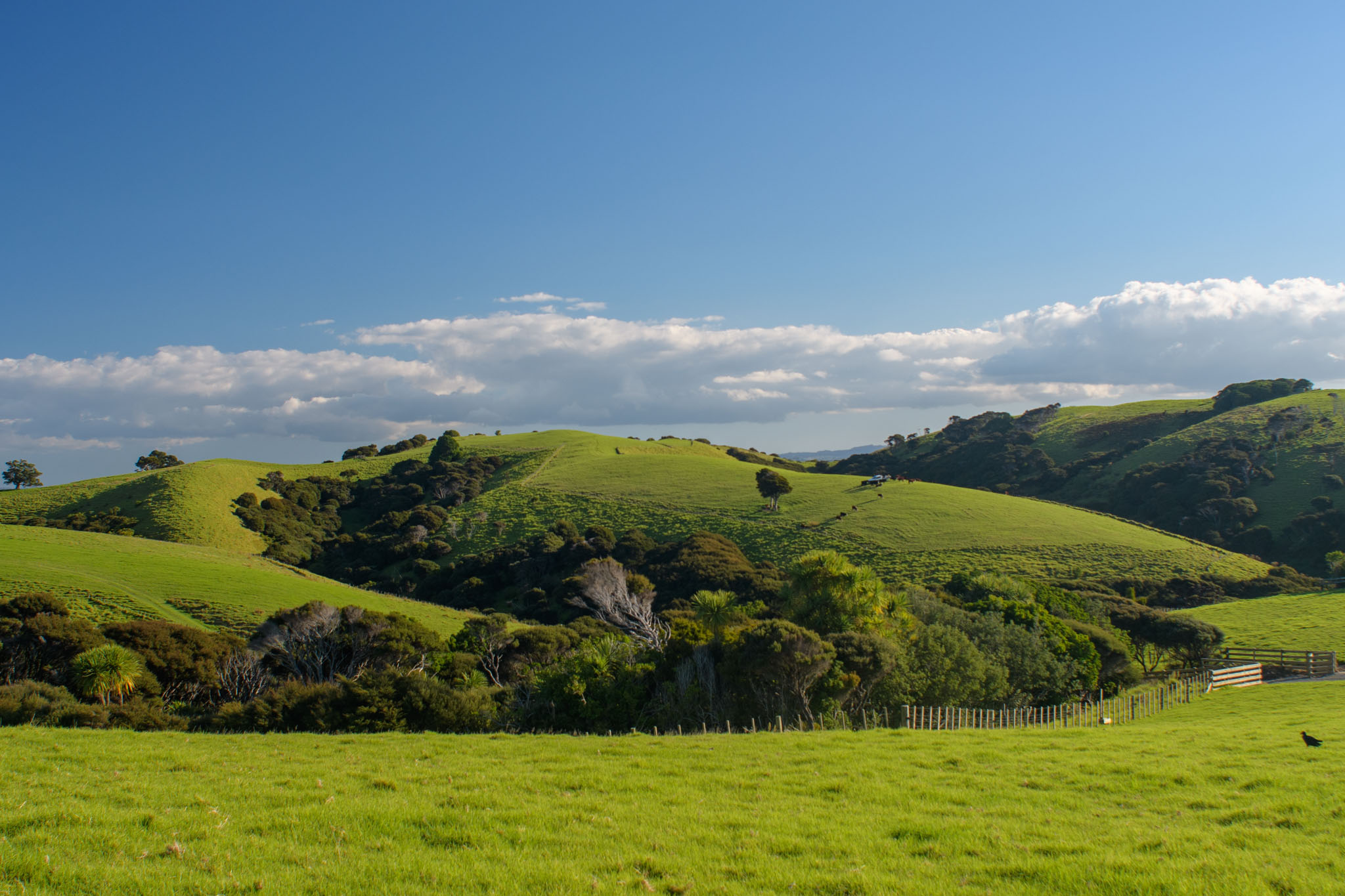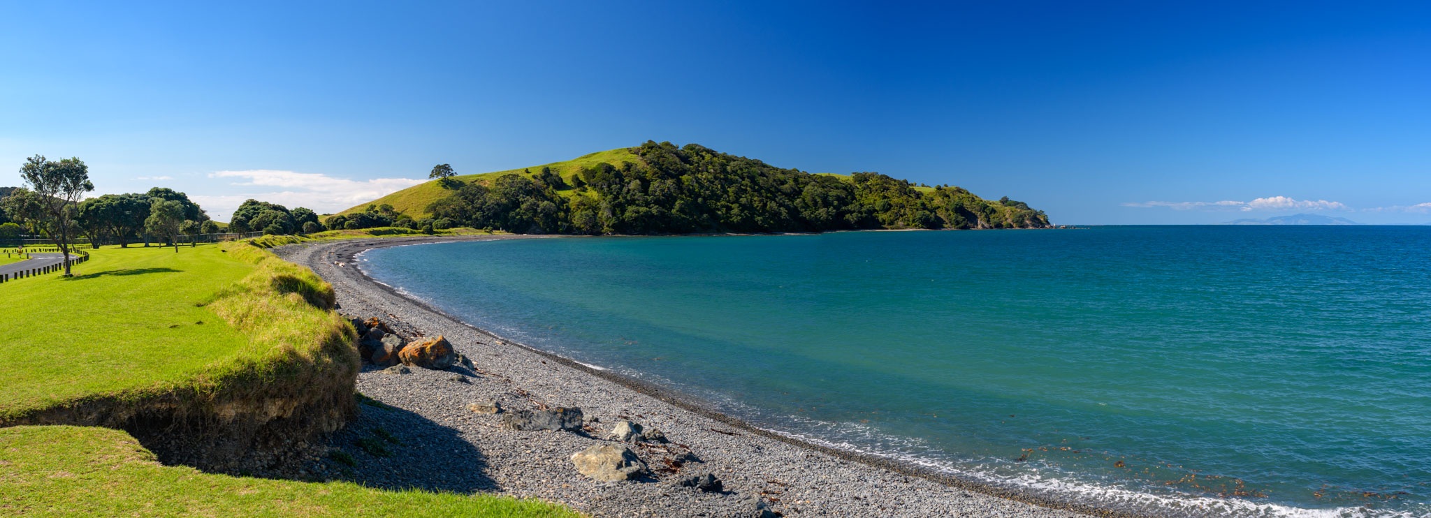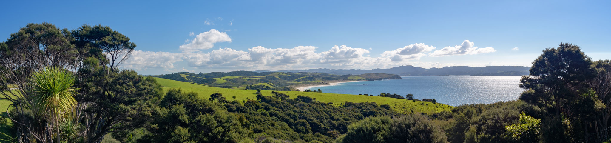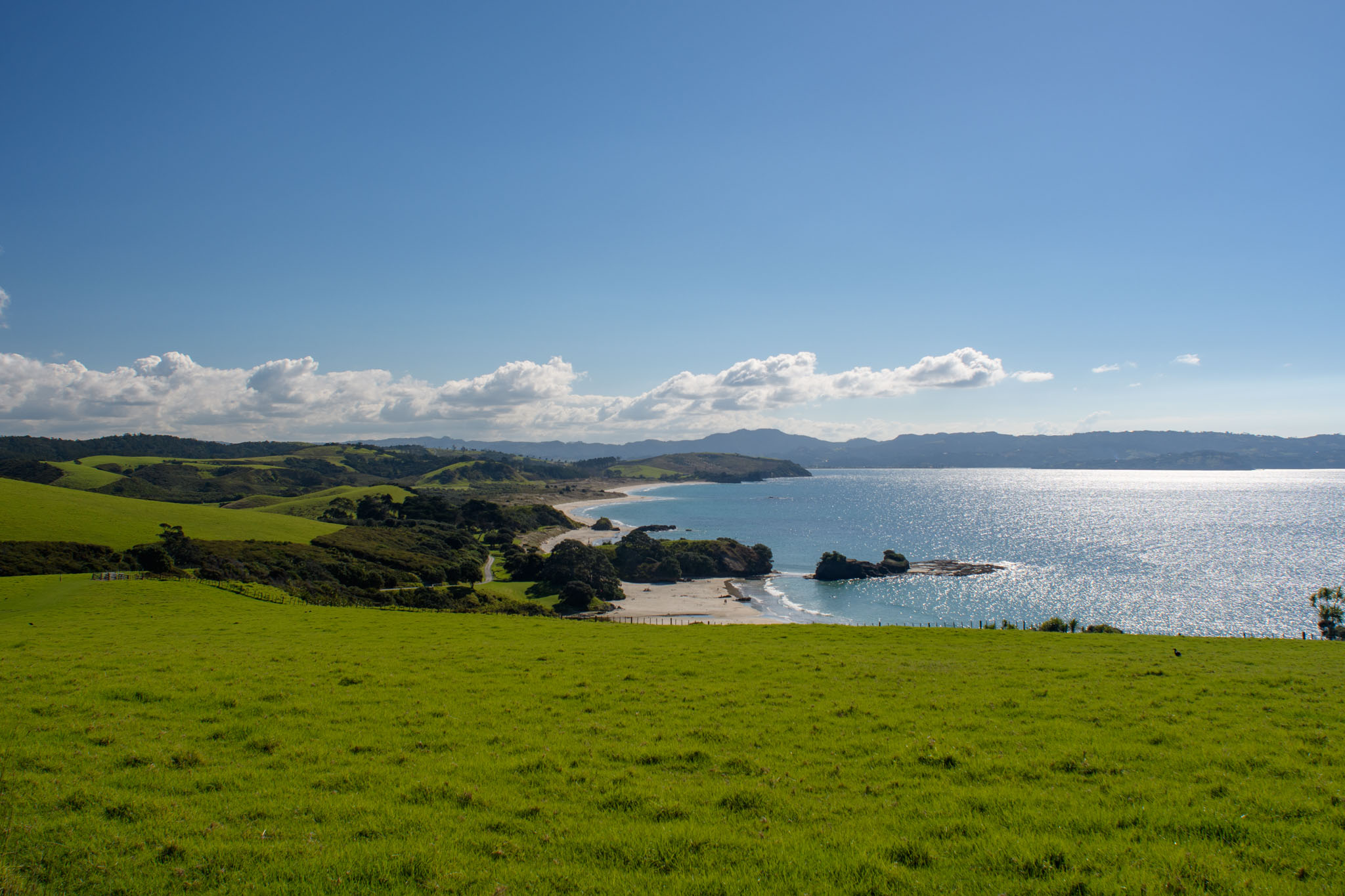 Die Landschaft ist hier wirklich so schön, wie wir es nach den Beschreibungen erwartet hatten – liebliche grüne Hügel und schöne Buchten und Strände mit Blick auf Little Barrier Island und die Coromandel. Und anders als manche anderen Gegenden im Einzugsbereich von Auckland gibt es wenige Besucher, so dass man sehr schnell ungestört ist.