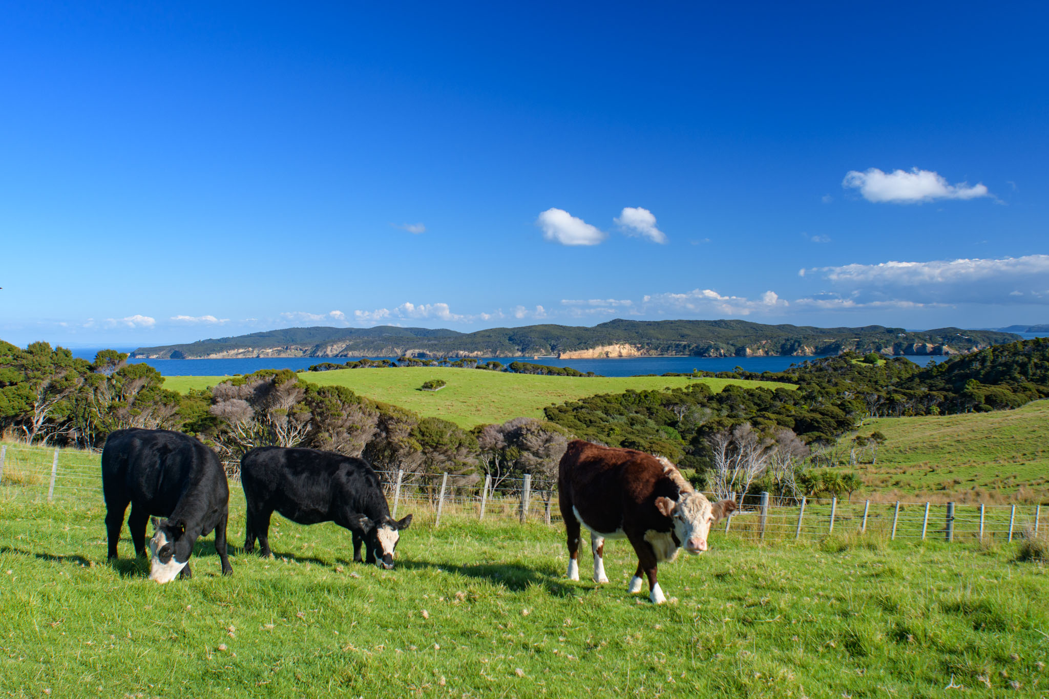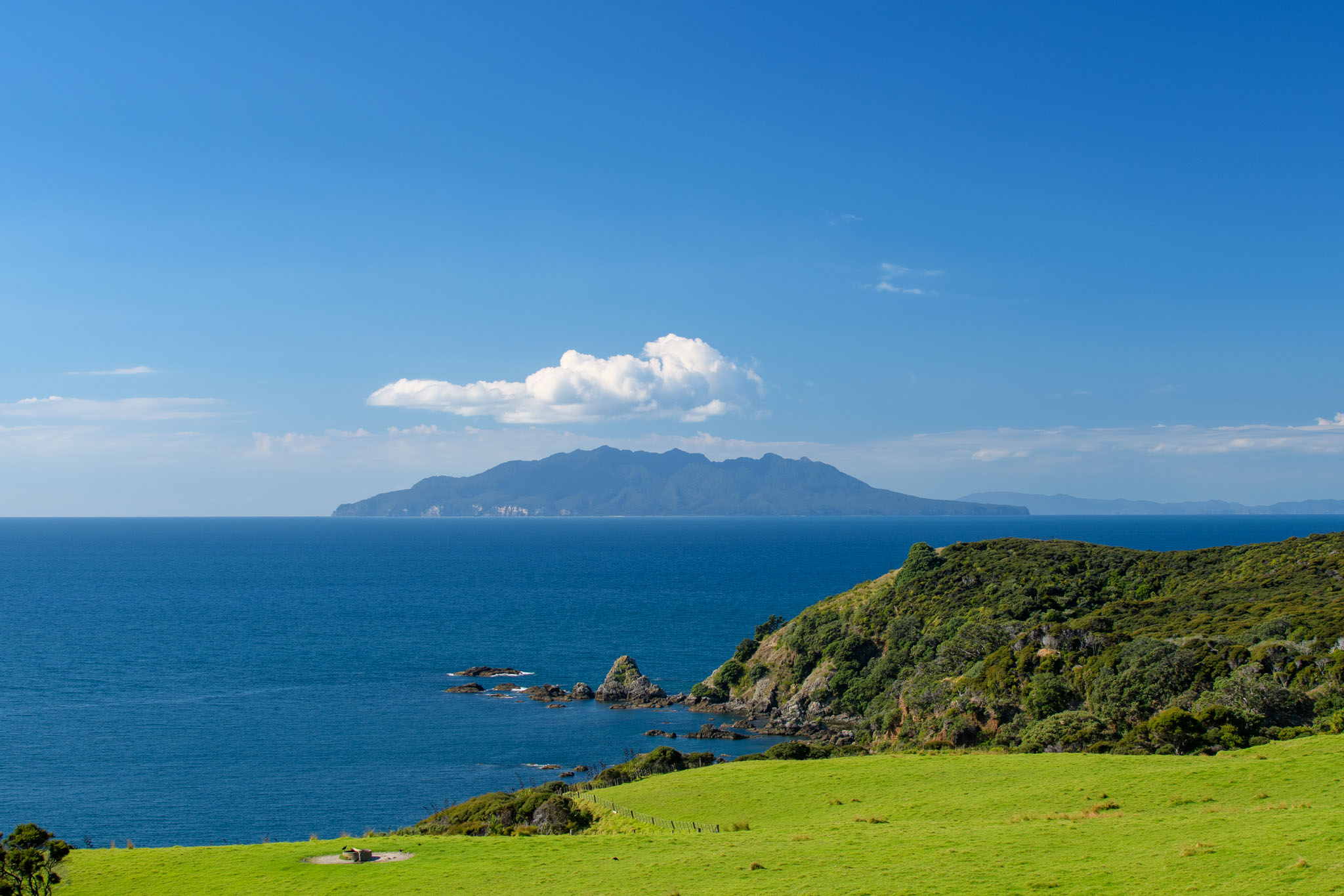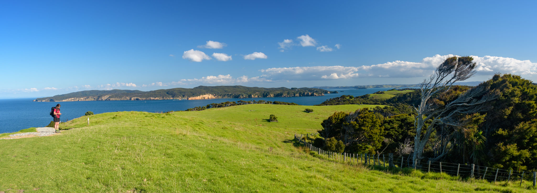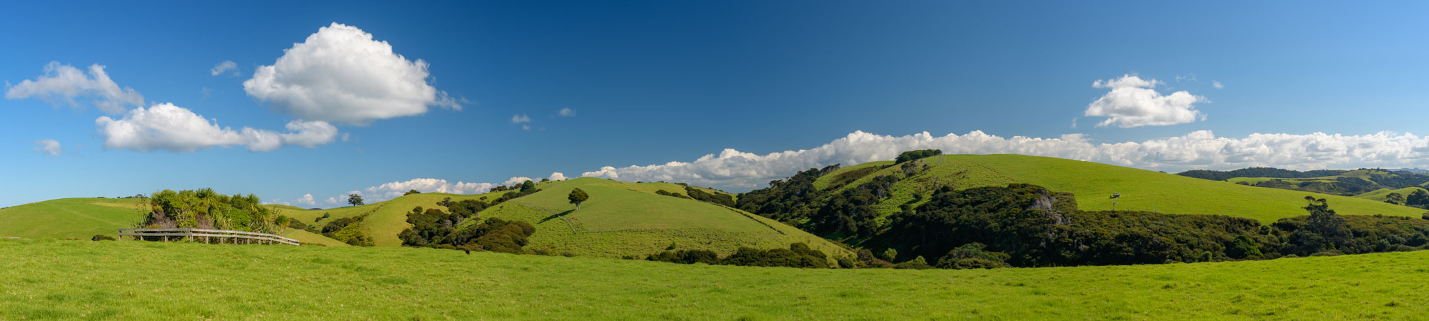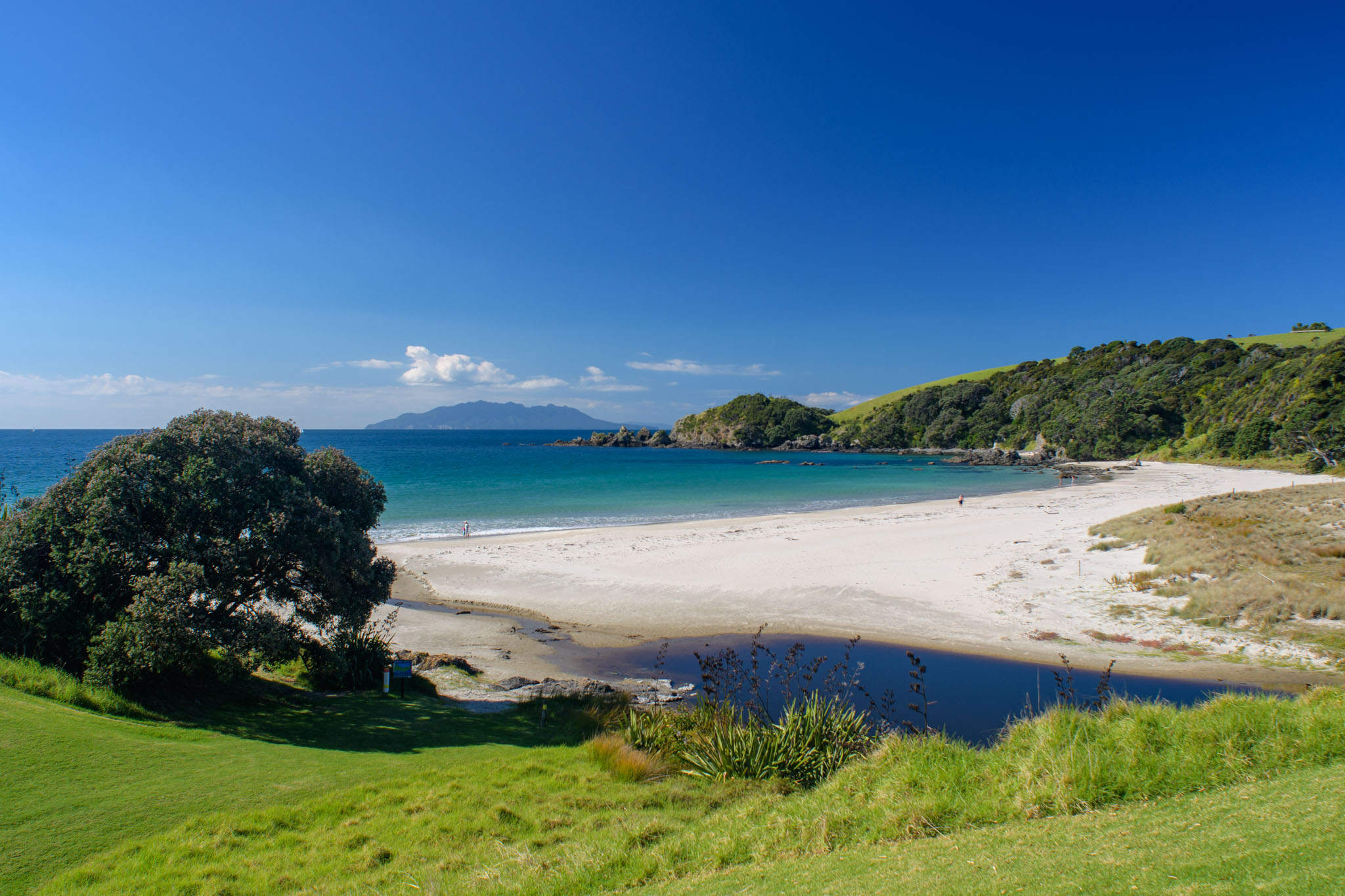 Die Landschaft ist hier wirklich so schön, wie wir es nach den Beschreibungen erwartet hatten – liebliche grüne Hügel und schöne Buchten und Strände mit Blick auf Little Barrier Island und die Coromandel. Und anders als manche anderen Gegenden im Einzugsbereich von Auckland gibt es wenige Besucher, so dass man sehr schnell ungestört ist.