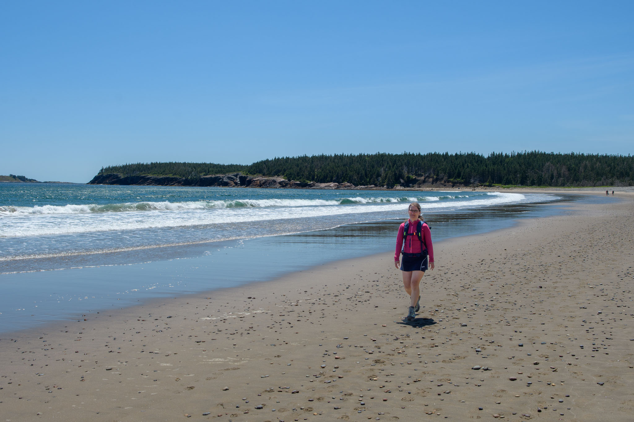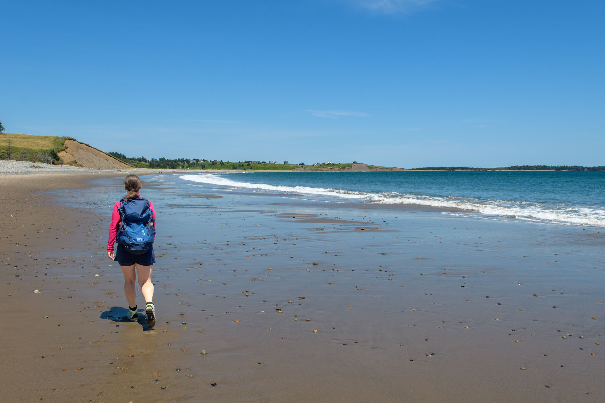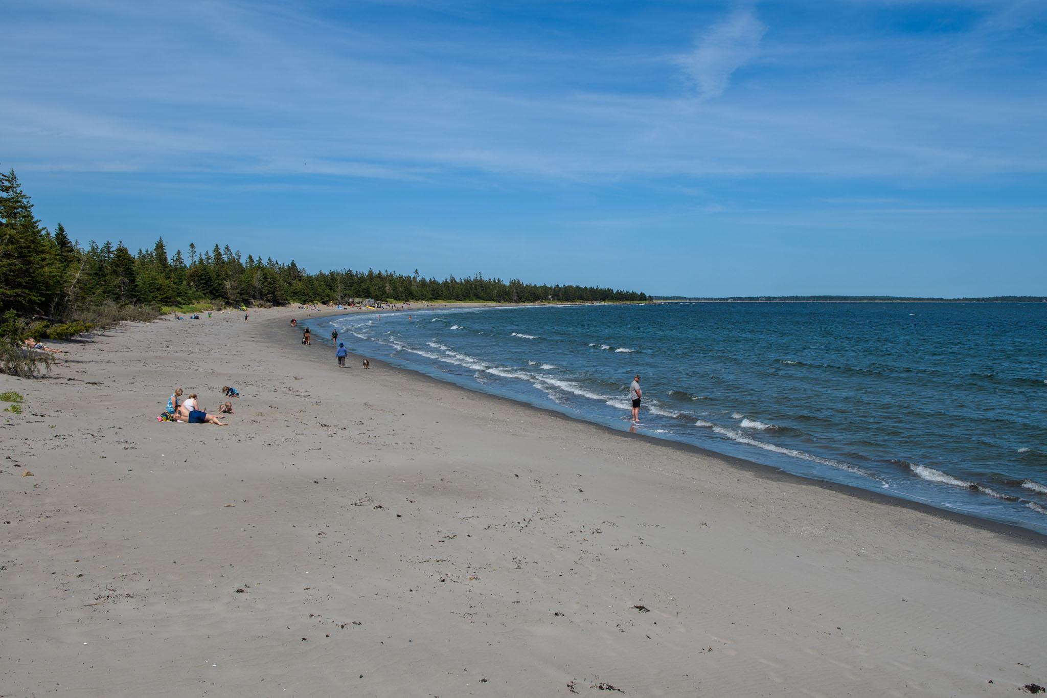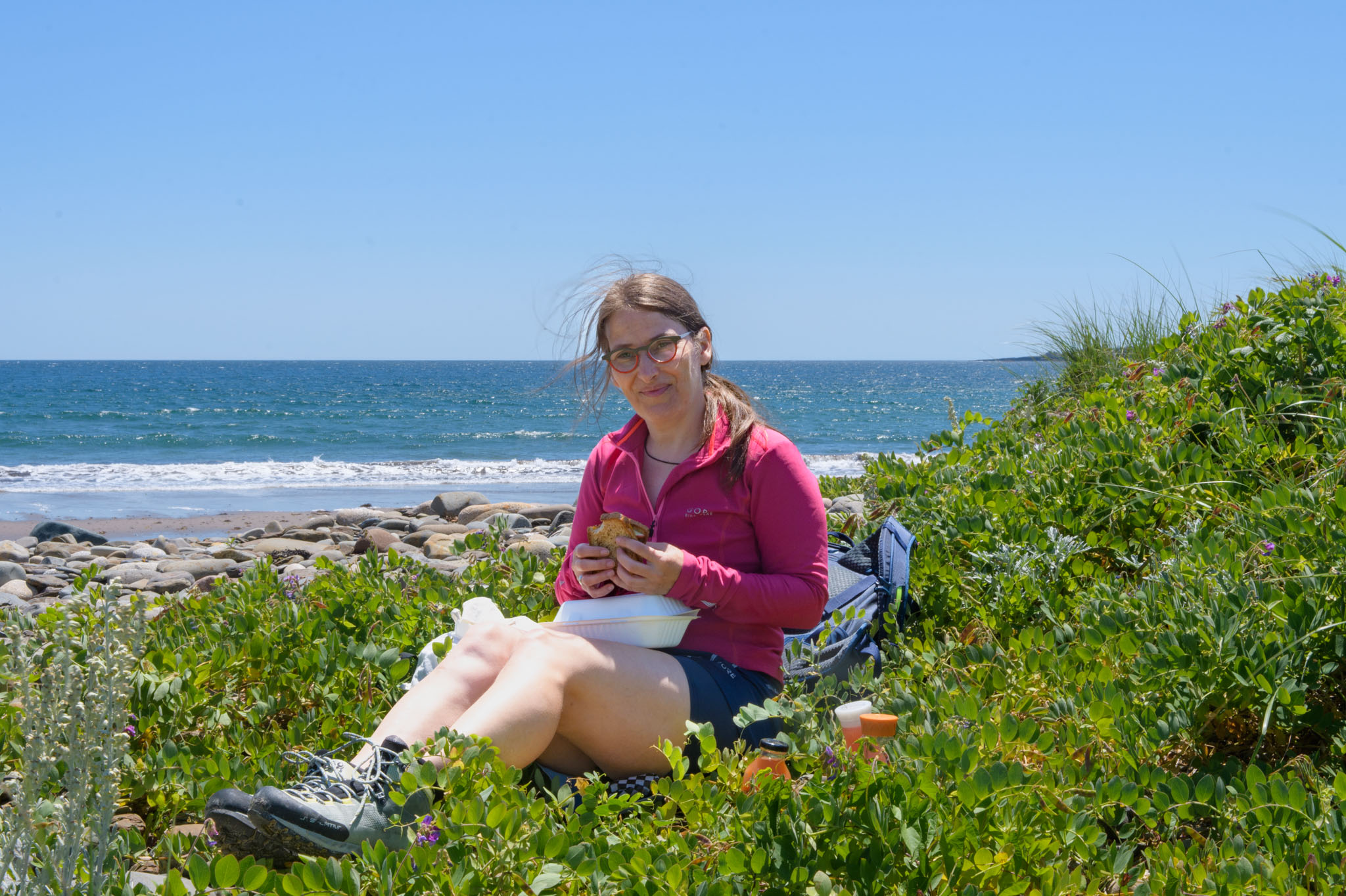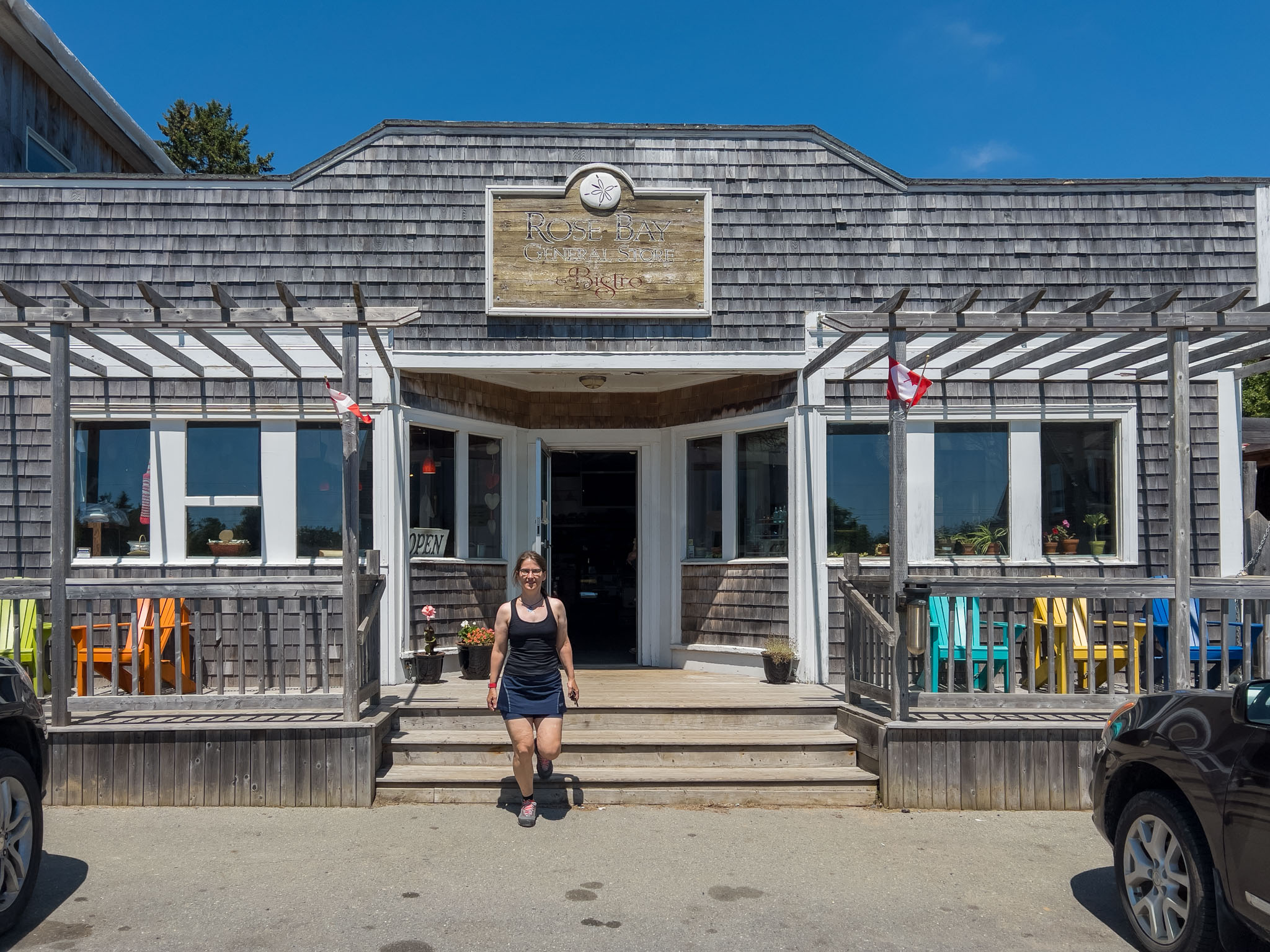 Am frühen Nachmittag haben wir in Rose Bay erneut an einem urigen General Store Halt gemacht. Der Laden wird von zwei Deutschen geführt und man bekommt unzählige deutsche Lebensmittel: Haribo, Trolli und Katjes sind ja fast schon Standard in Kanada, aber Niederegger Marzipan, eingelegte Gurken von Kühne und Weißwurstsenf von Löwensenf sind dann hier in der Gegend doch üblicherweise nicht erhältlich. Wir haben uns mit je einem warmen Sandwich und einem Grapefruitsaft eingedeckt, was wir am Hirtle's Beach – unserem nächsten Ziel – am Strand als spätes Mittagessen hatten.