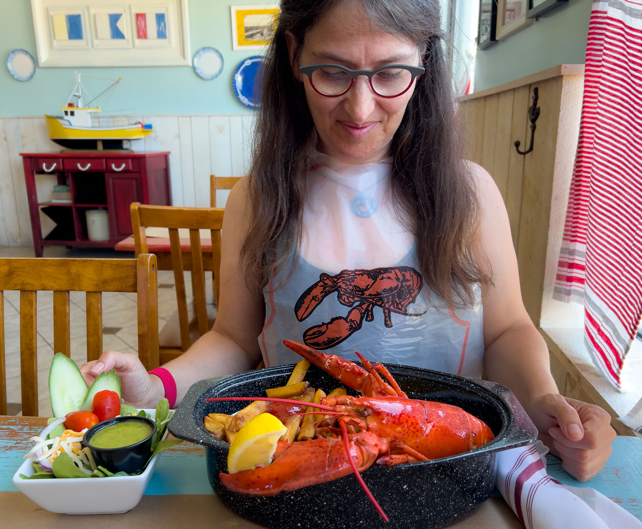 Nun wurde es endlich Zeit für den eigentlichen Höhepunkt dieses Urlaubs, auf den Maria schon seit Wochen entgegengefiebert hat. Gegen 15:30 Uhr waren wir so ausgezehrt, dass wir uns mit knurrendem Magen und letzter Kraft in Barrington, dem "Lobster Capital", in ein Hummer-Restaurant schleppten und einen kompletten Hummer plus eine Lobster Roll bestellten. Der Verzicht auf ein Mittagessen hat sich gelohnt. Die beiden Lobster (und alles, was es dazu gab), waren wirklich toll. Schade, dass wir morgen nach dem Frühstück zu satt sein werden, um gleich noch einmal vorbei zu schauen.
