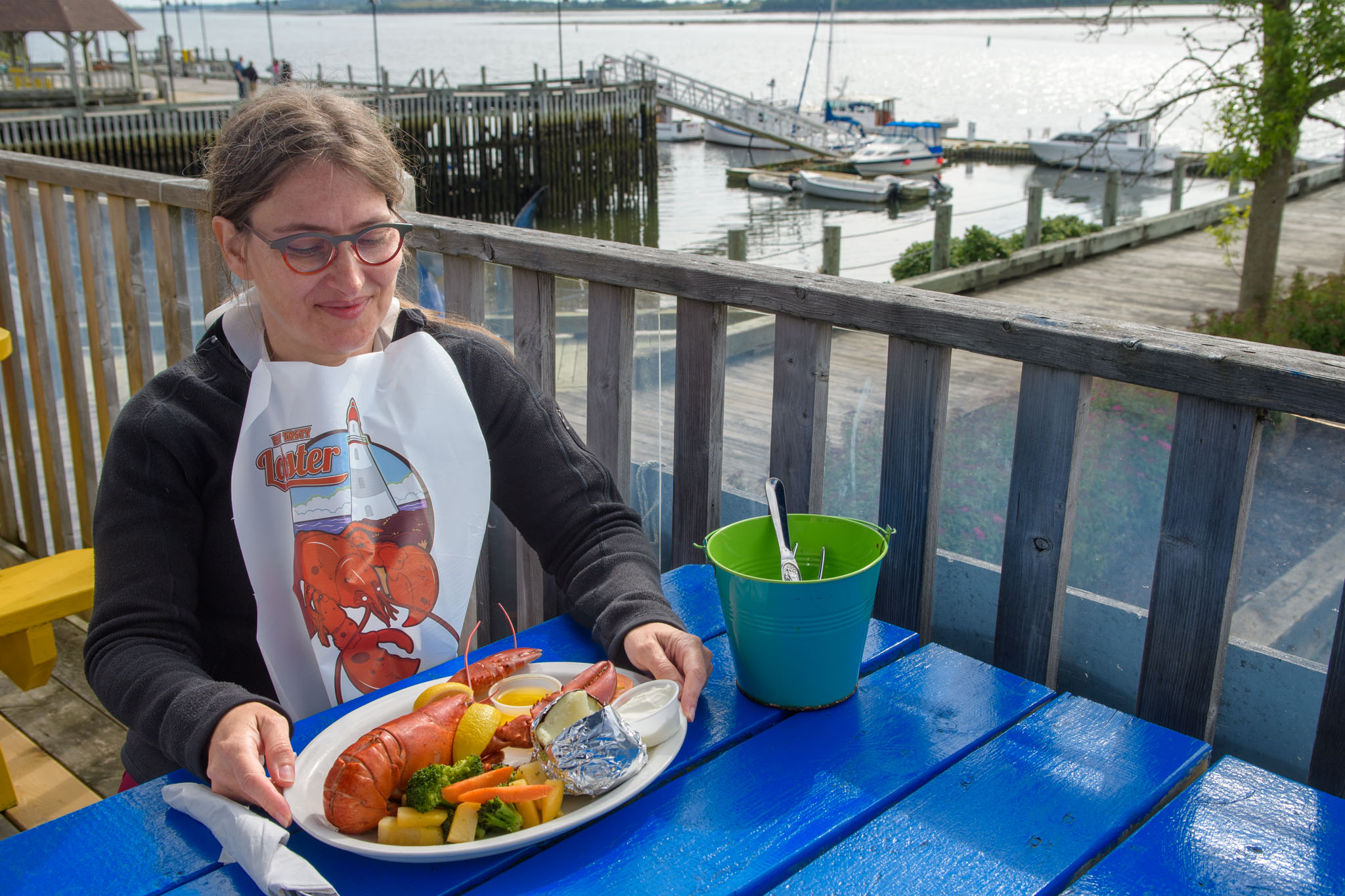 Nach dem Einchecken in Yarmouth sind wir dann in die Stadt. Das Lobster-Restaurant lag direkt an der Waterfront und wir haben uns draußen auf die Terrasse gesetzt. Der Lobster war etwas kleiner als der von gestern (1 lb zu 1¼ lb) und die Beilagen waren nicht so gut (das Tier selbst war genauso gut), doch dafür hat er weniger als die Hälfte gekostet.