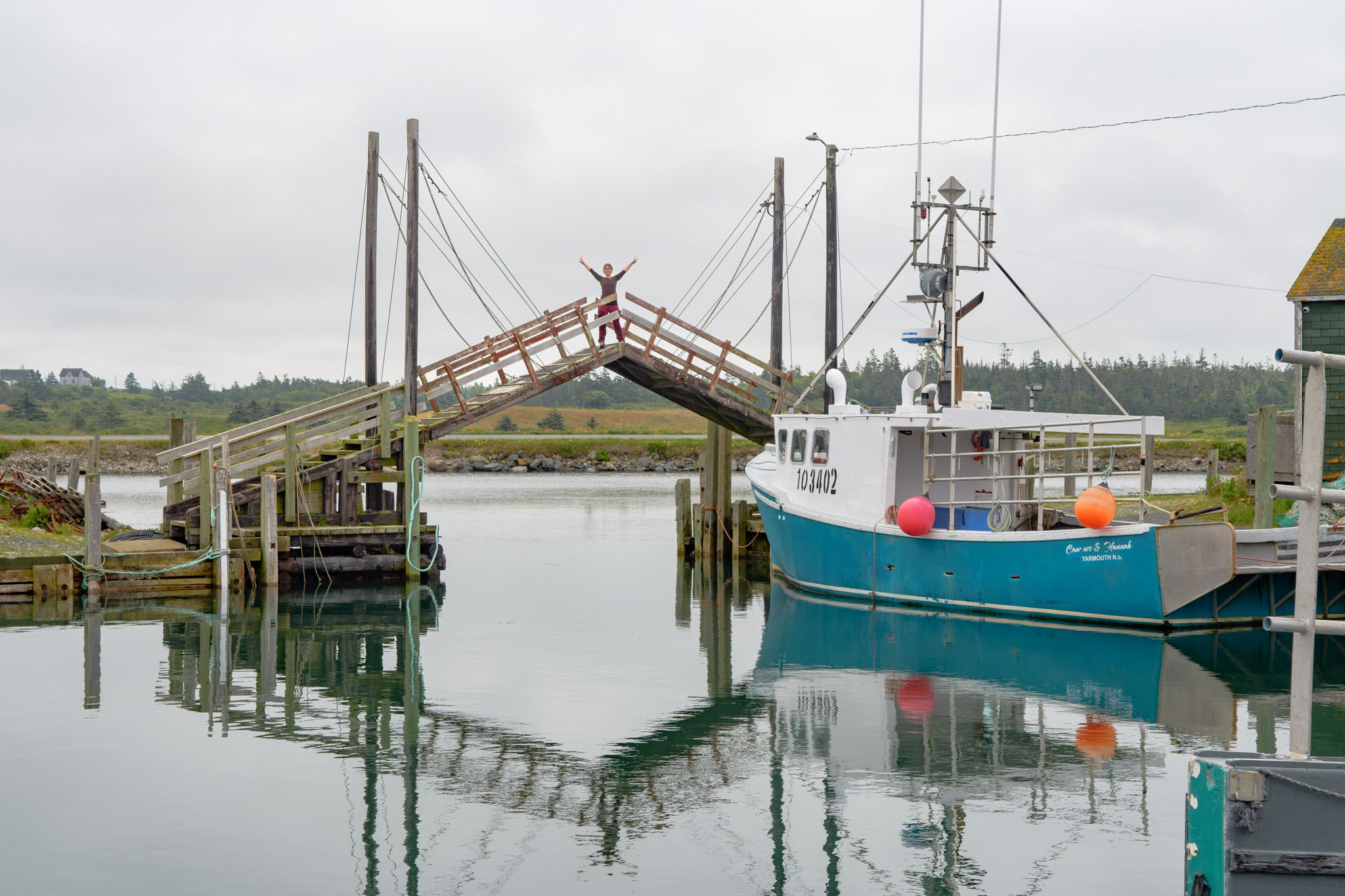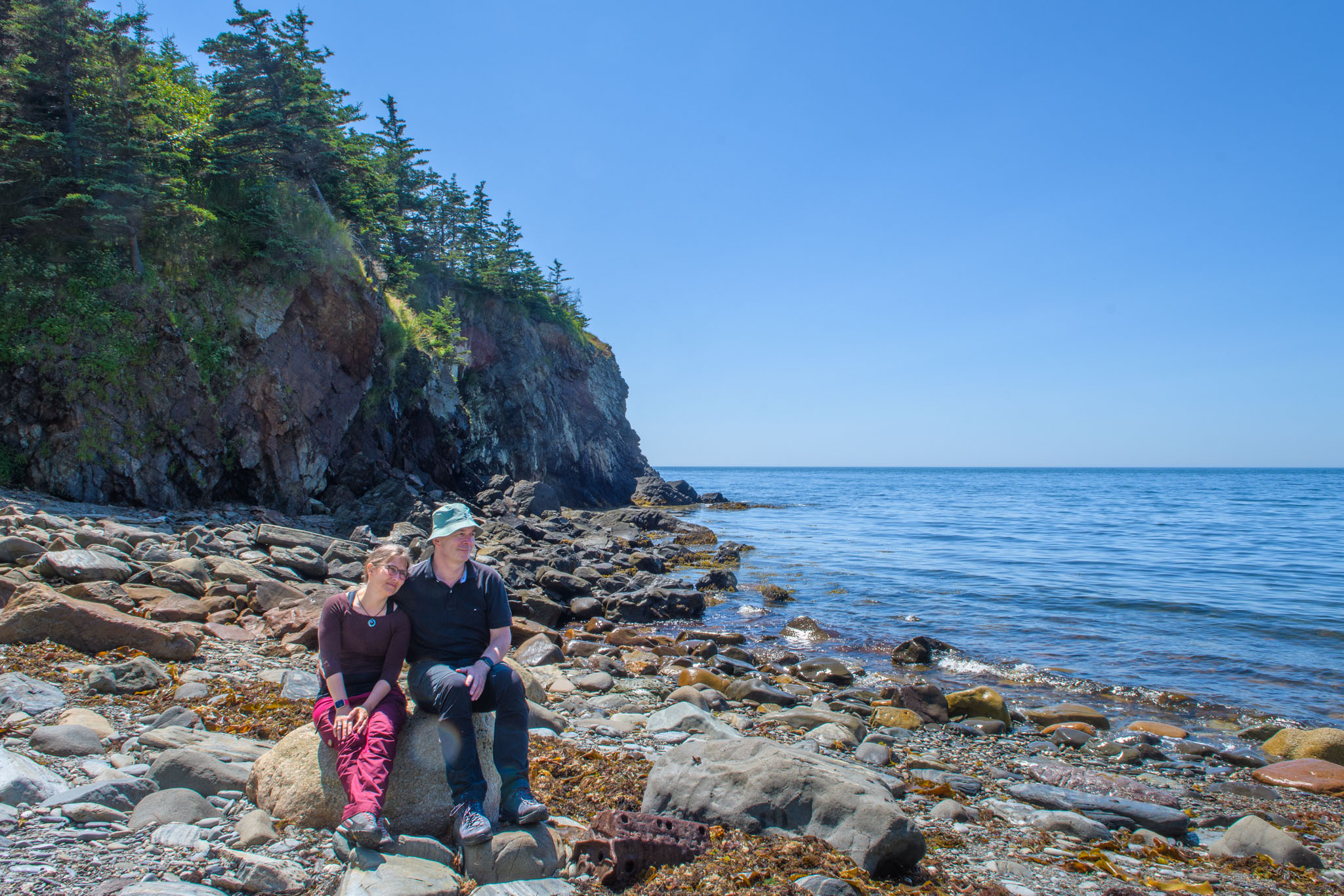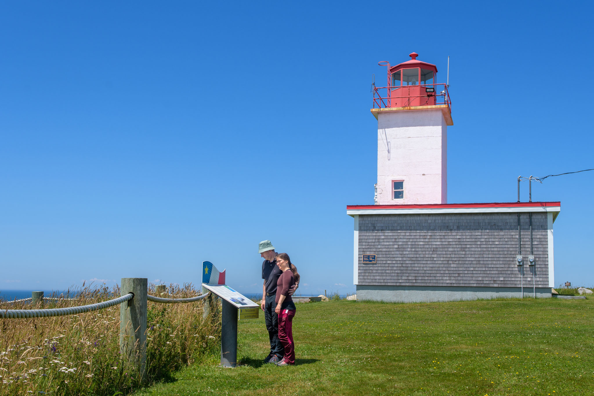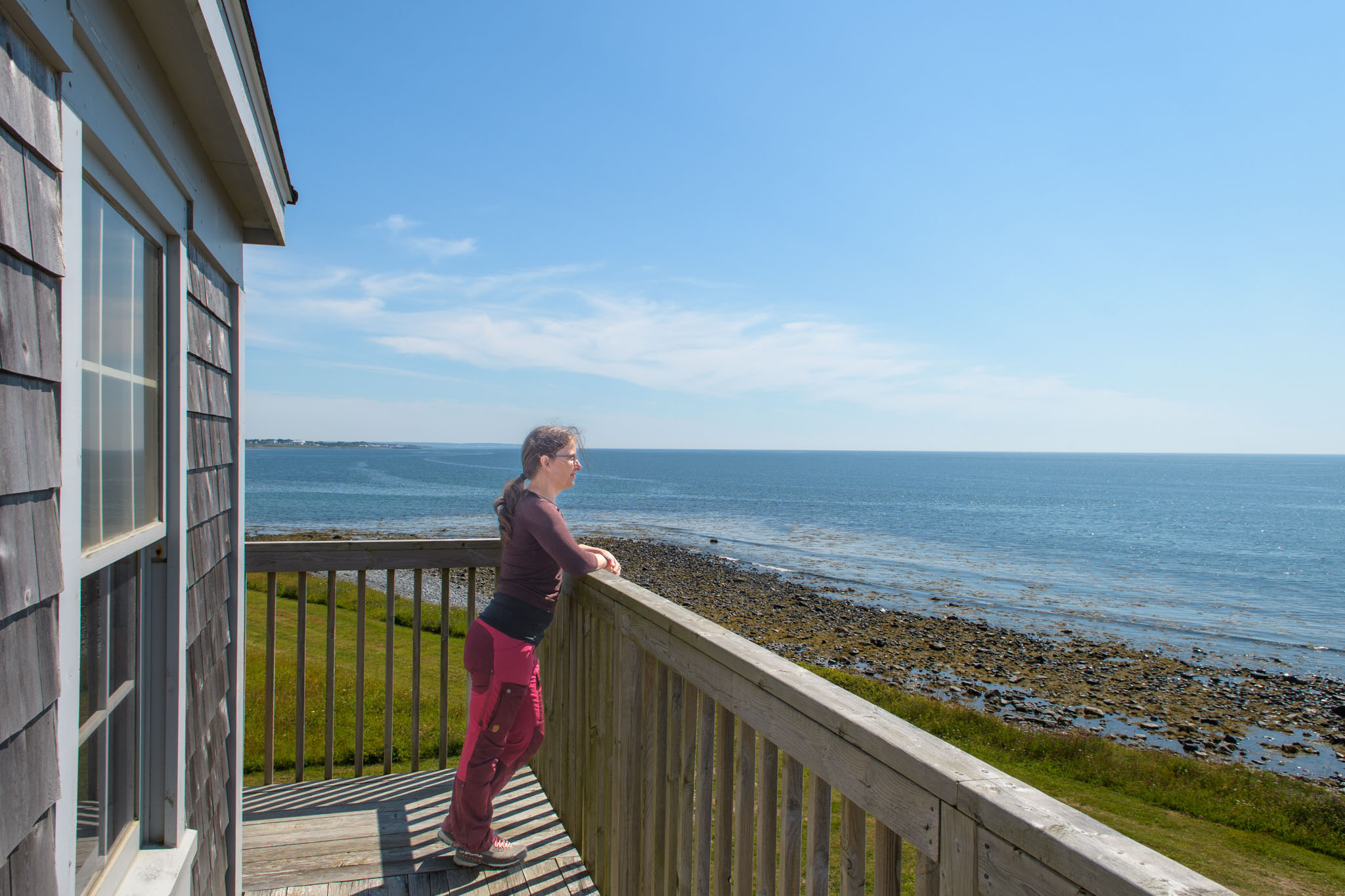 Vor dem zweiten Frühstück haben wir noch einen Lehrpfad über die First Nations und die Natur hier in der Gegend abgewandert. Wie viele Strände und Buchten wir dann unterwegs besucht und wie viele kleine Wanderungen wir eingelegt haben, können wir euch nicht sagen – wir haben vergessen, mitzuzählen. Es war jedenfalls eine richtig interessante Brücke in einem kleinen Hafen und Leuchttürme waren es zwei, wobei einer nicht so ganz typisch aussieht. Wie schon gestern hat es ein Stück gedauert, bis die Sonne die Wolken vertrieben hatte, ab mittags brannte sie aber wieder erbarmungslos.