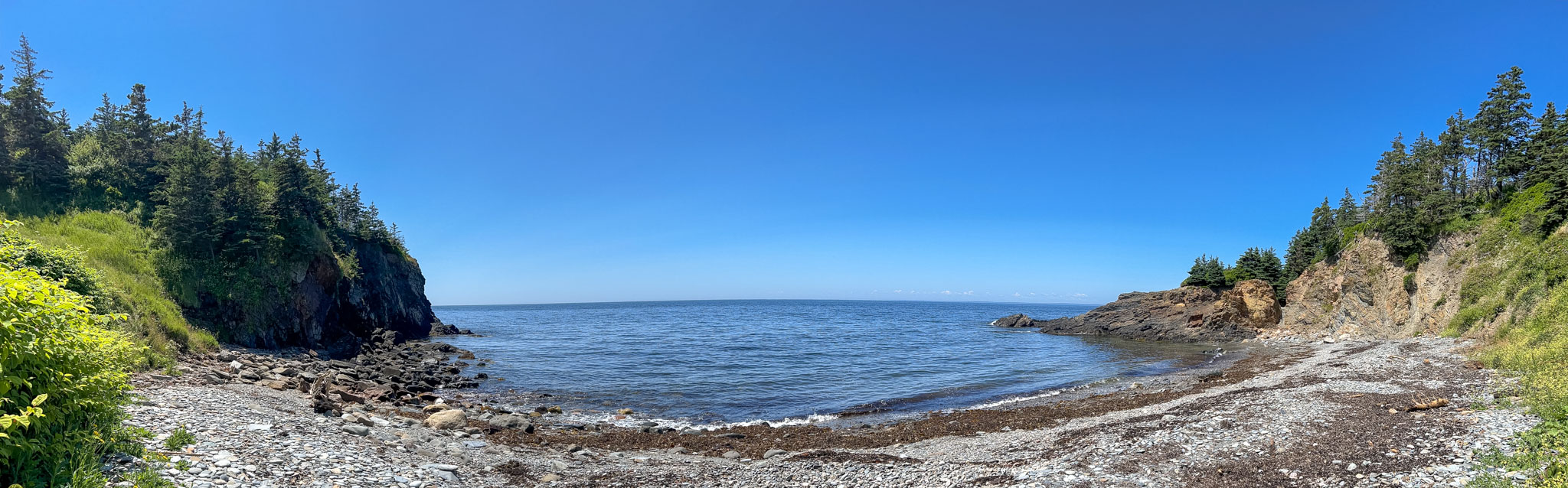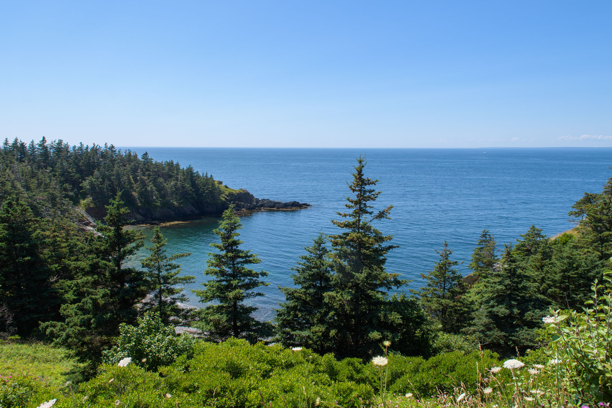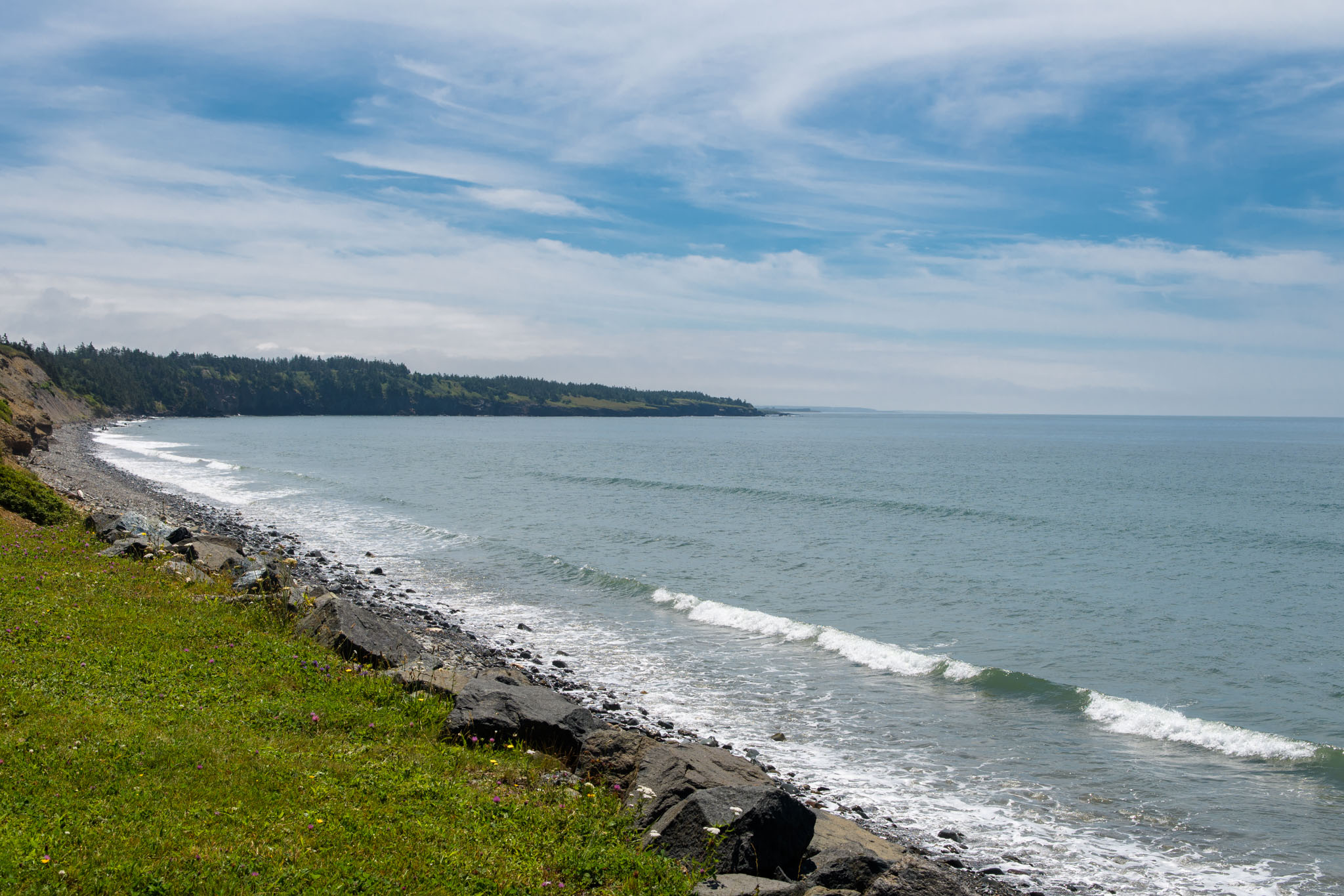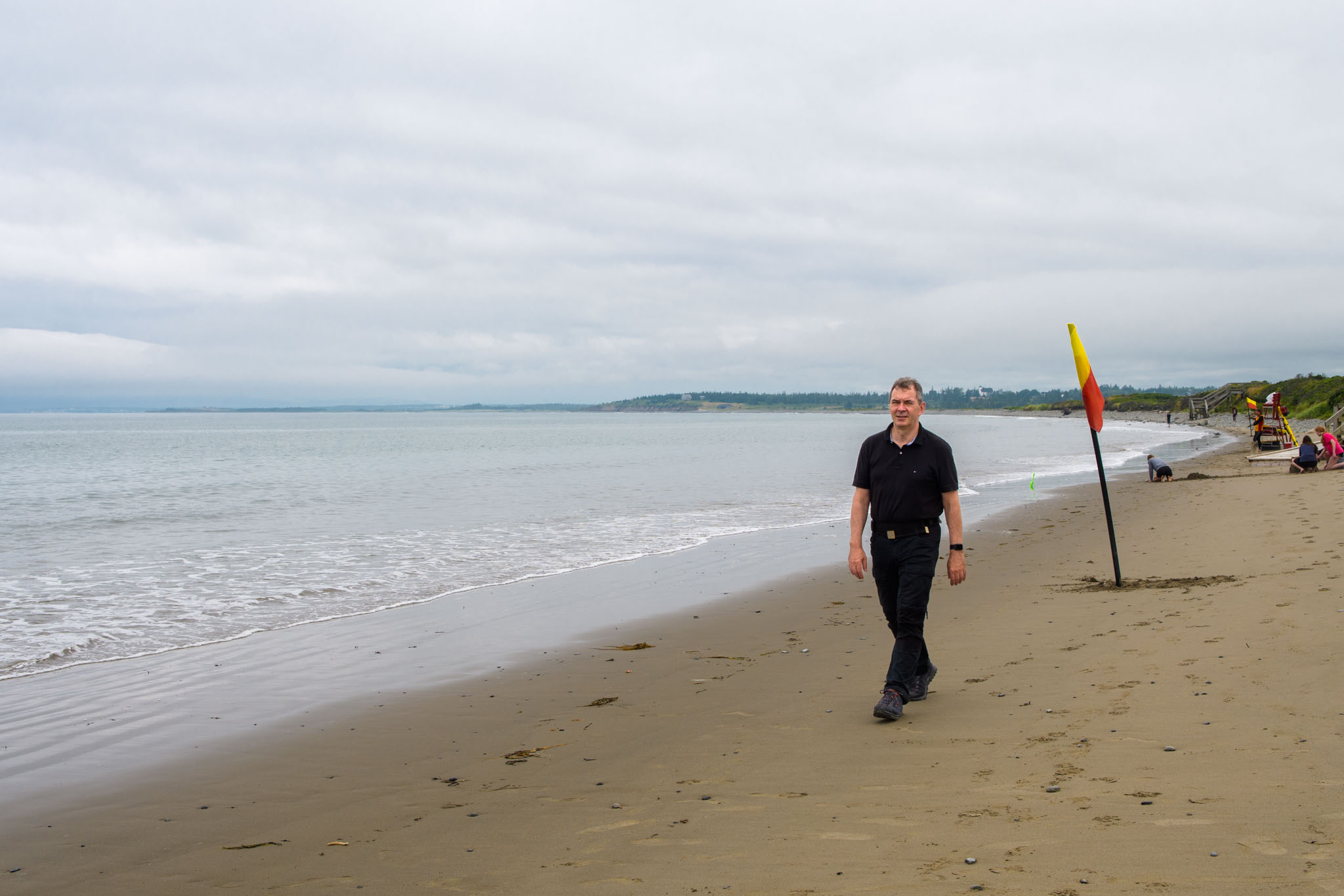 Vor dem zweiten Frühstück haben wir noch einen Lehrpfad über die First Nations und die Natur hier in der Gegend abgewandert. Wie viele Strände und Buchten wir dann unterwegs besucht und wie viele kleine Wanderungen wir eingelegt haben, können wir euch nicht sagen – wir haben vergessen, mitzuzählen. Es war jedenfalls eine richtig interessante Brücke in einem kleinen Hafen und Leuchttürme waren es zwei, wobei einer nicht so ganz typisch aussieht. Wie schon gestern hat es ein Stück gedauert, bis die Sonne die Wolken vertrieben hatte, ab mittags brannte sie aber wieder erbarmungslos.