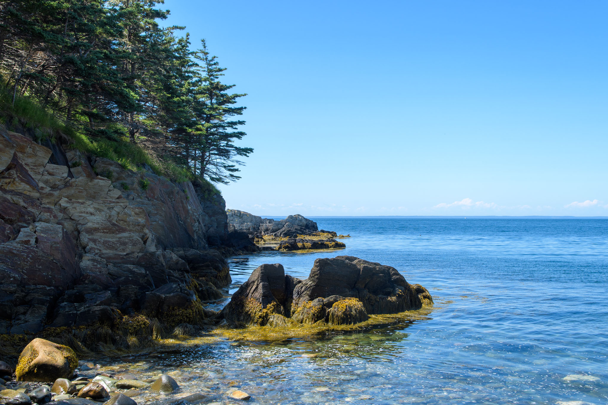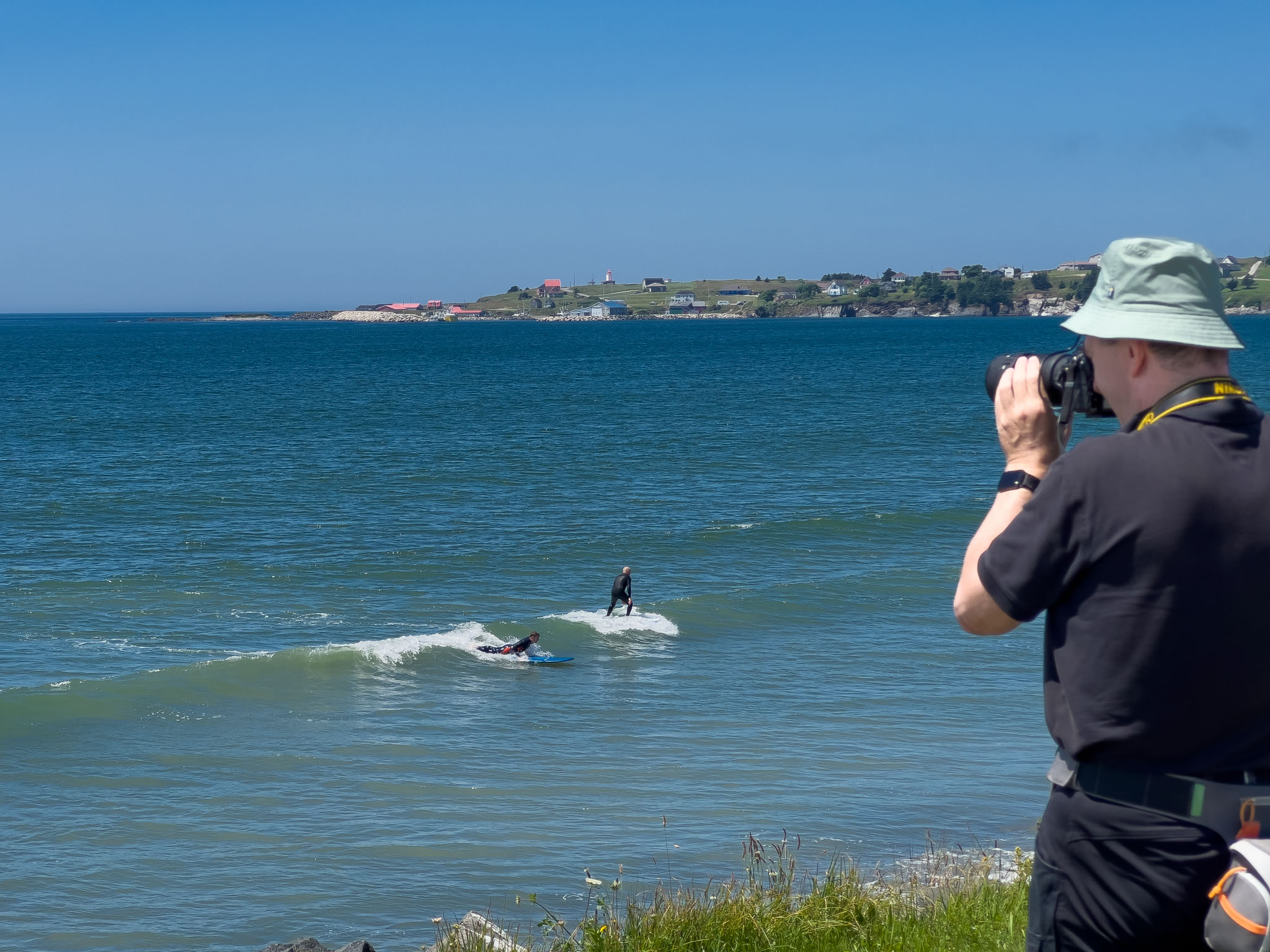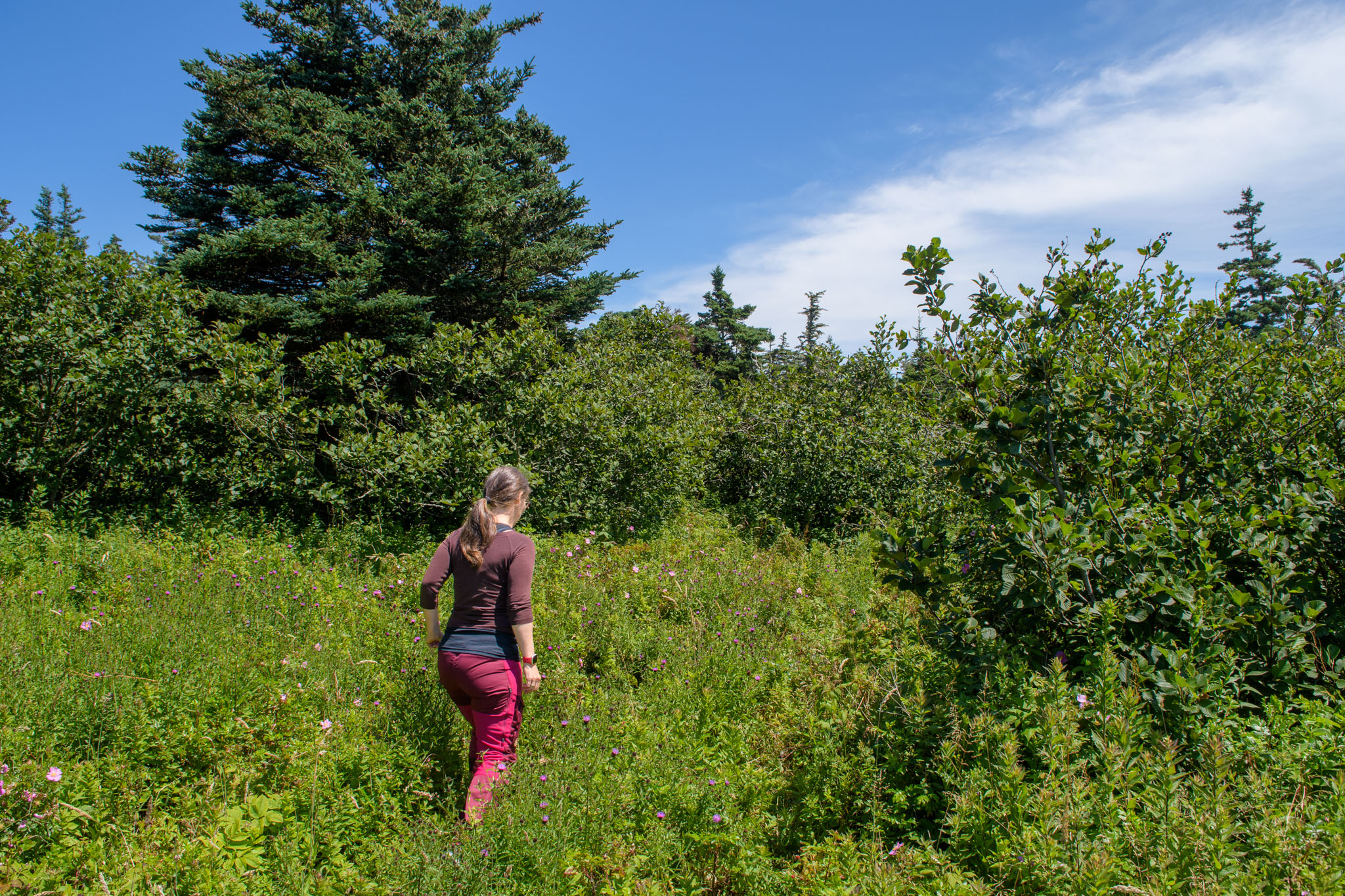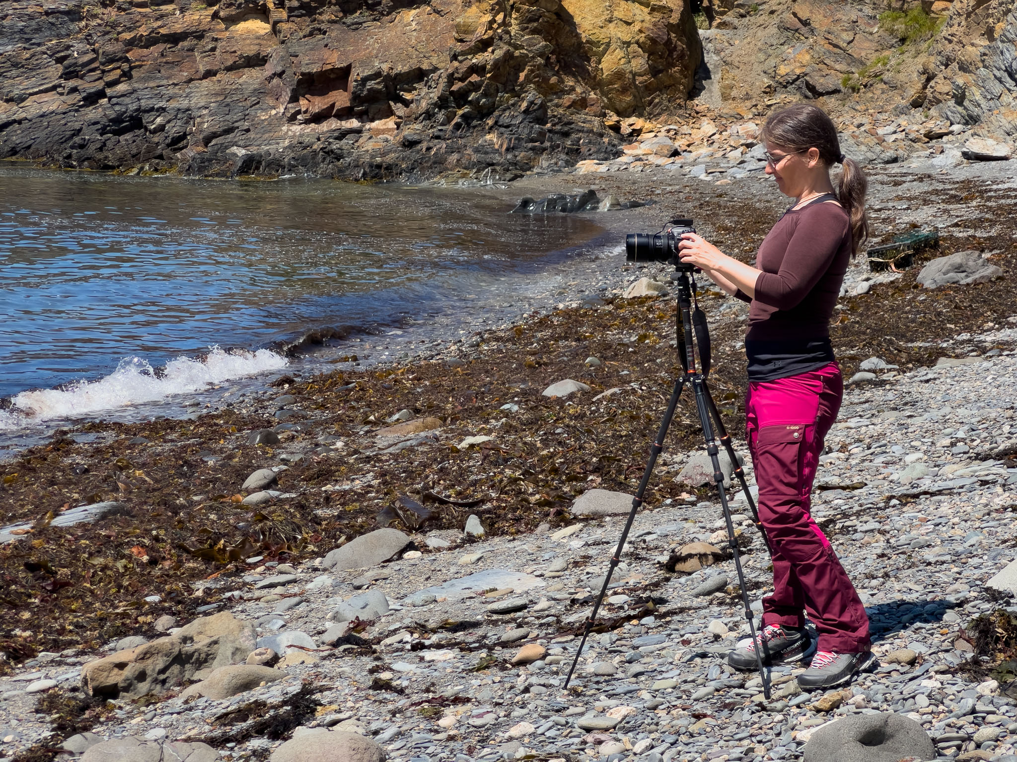 Vor dem zweiten Frühstück haben wir noch einen Lehrpfad über die First Nations und die Natur hier in der Gegend abgewandert. Wie viele Strände und Buchten wir dann unterwegs besucht und wie viele kleine Wanderungen wir eingelegt haben, können wir euch nicht sagen – wir haben vergessen, mitzuzählen. Es war jedenfalls eine richtig interessante Brücke in einem kleinen Hafen und Leuchttürme waren es zwei, wobei einer nicht so ganz typisch aussieht. Wie schon gestern hat es ein Stück gedauert, bis die Sonne die Wolken vertrieben hatte, ab mittags brannte sie aber wieder erbarmungslos.
