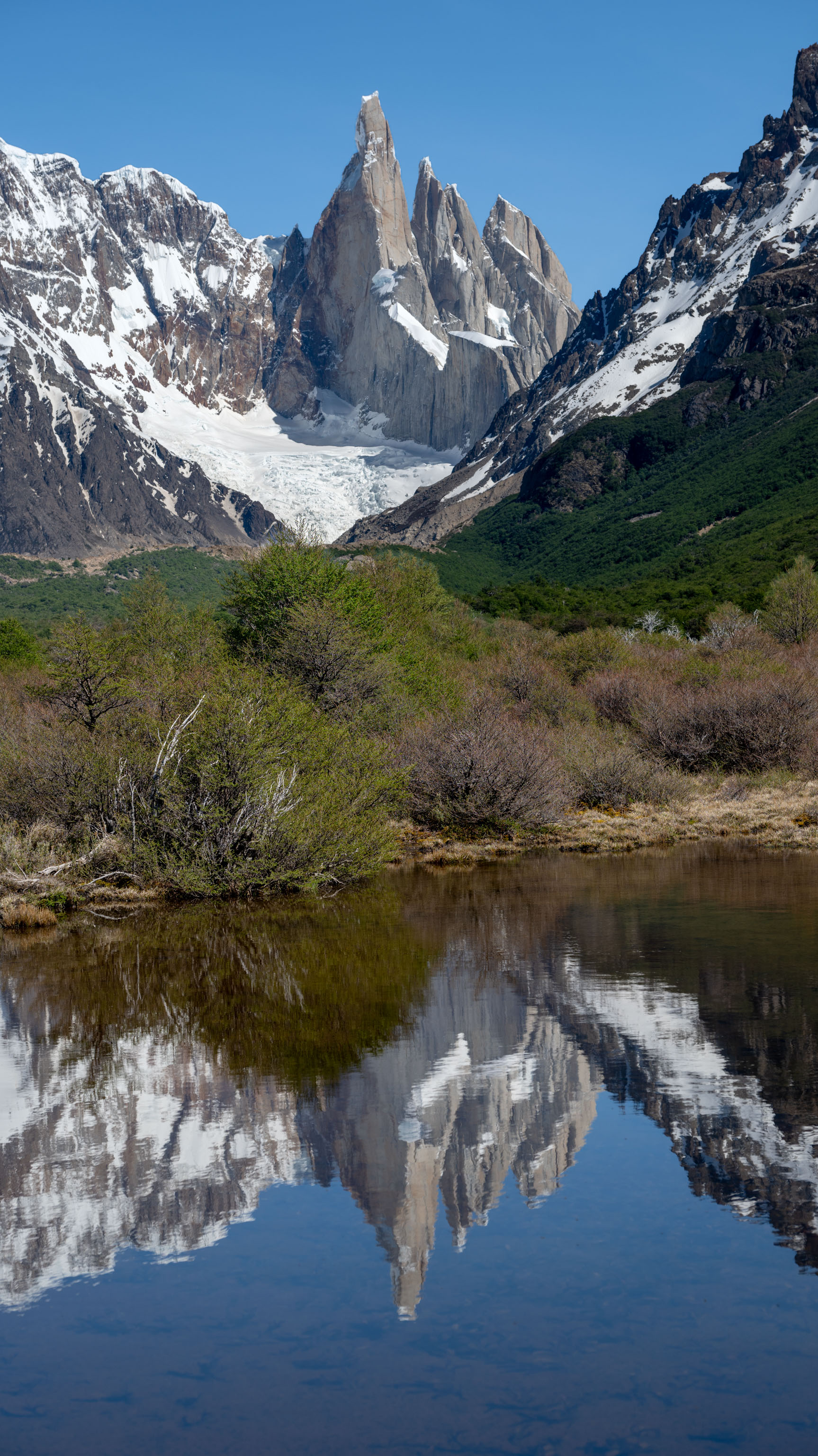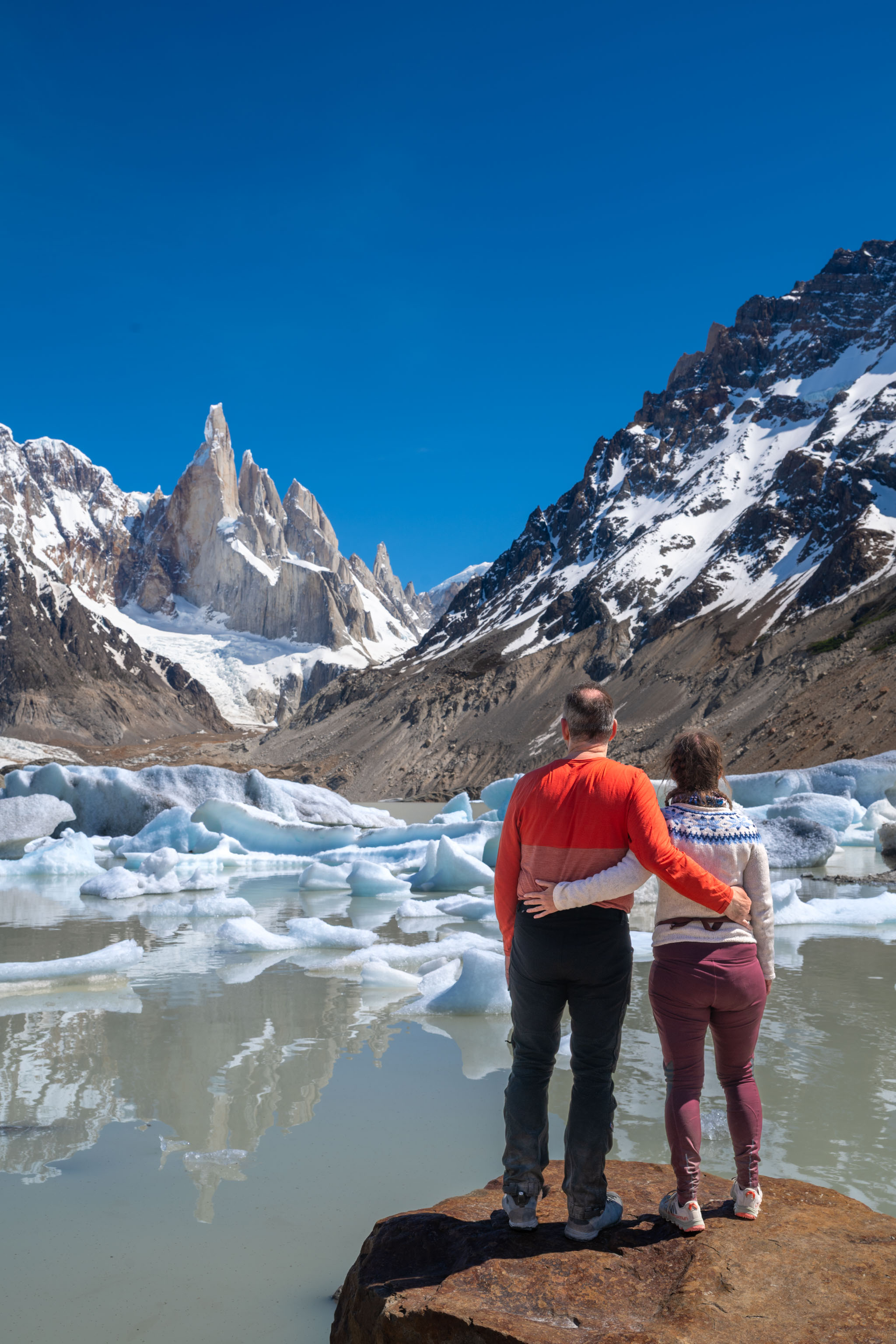 In der Lagune schwimmen eine ganze Menge an kleinen Eisbergen von den Gletschern, die rechts und links vom Cerro Torre herunterfließen und in die Laguna kalben.