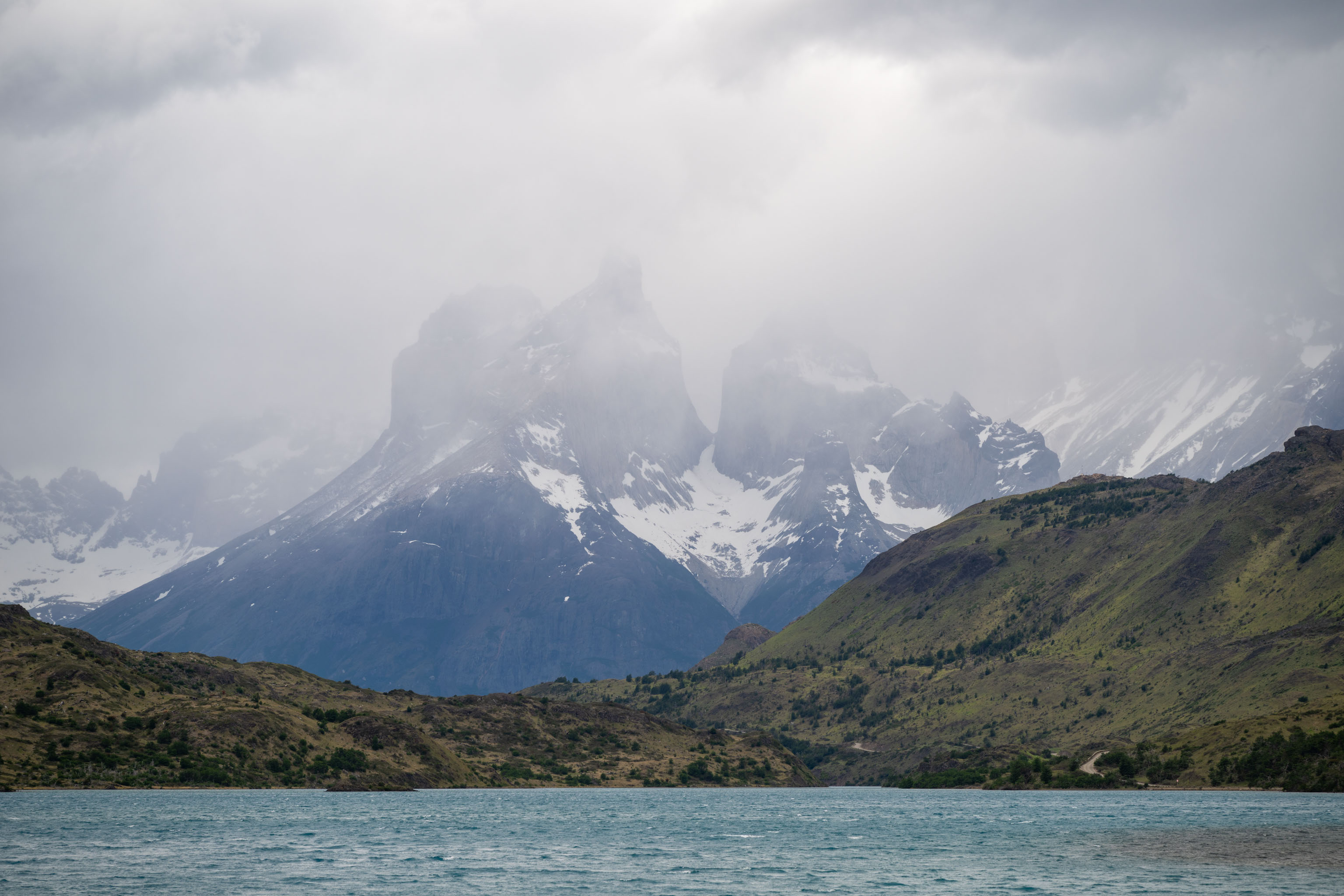 Normalerweise hätten wir unterwegs mehrere Fotostopps eingelegt, doch alle Berge waren grau in grau in Wolken, so dass wir (abgesehen vom Check-in in den Nationalpark) erst kurz vor unserem Hotel zweimal angehalten haben.