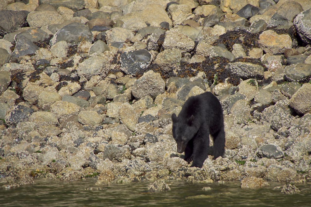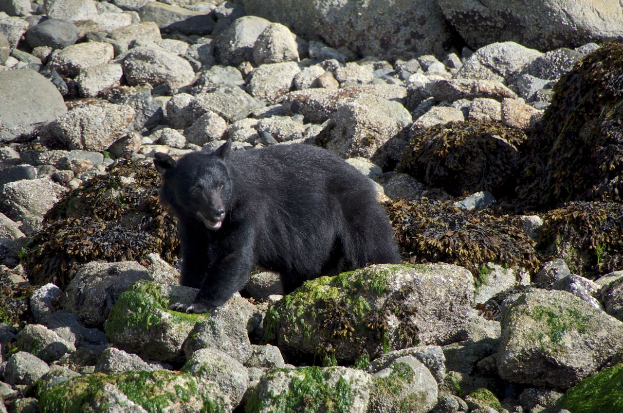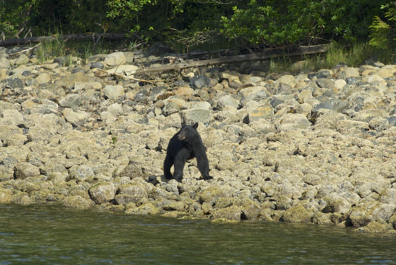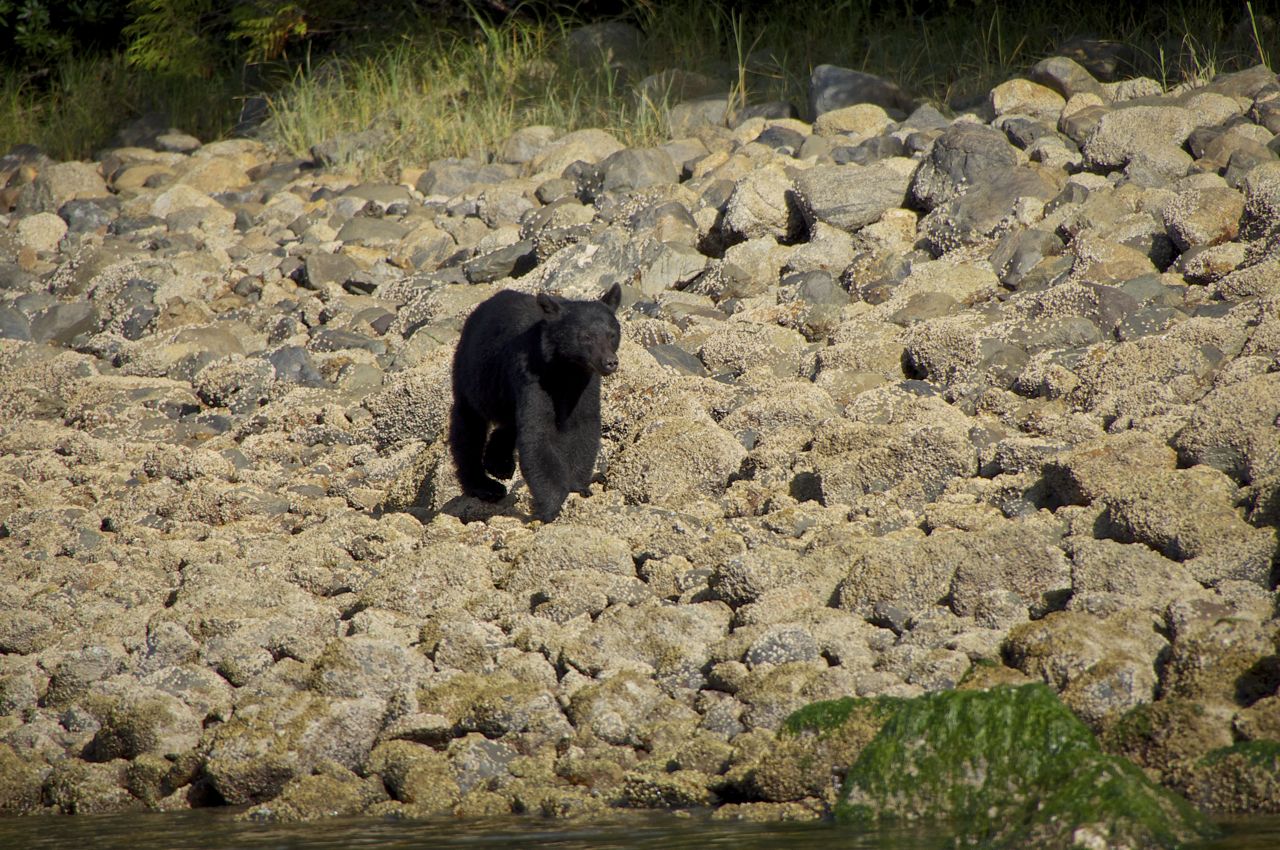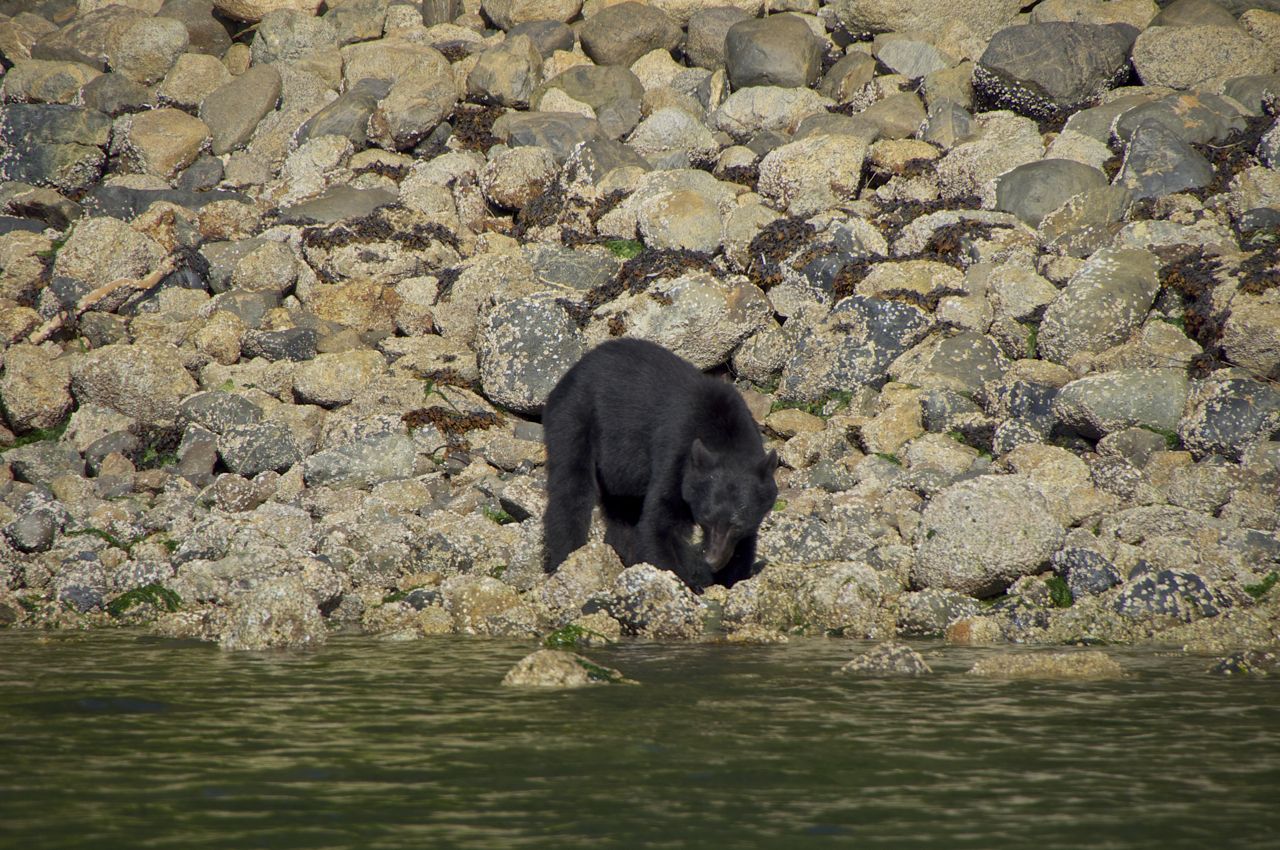 Schwarzbären sind hier in der Gegend recht einfach zu finden. Man brauchte bei Niedrigwasser nur mit dem Boot die Küste entlang zu fahren und nach ihnen Ausschau zu halten. Bei Niedrigwasser verlassen sie nämlich den Wald, wo sie Beeren essen, und kommen an den Strand. Dort drehen sie mit ihren Tatzen mit erstaunlicher Leichtigkeit richtig große Felsbrocken um, um darunter nach Krebsen und anderen Schalentieren zu suchen.