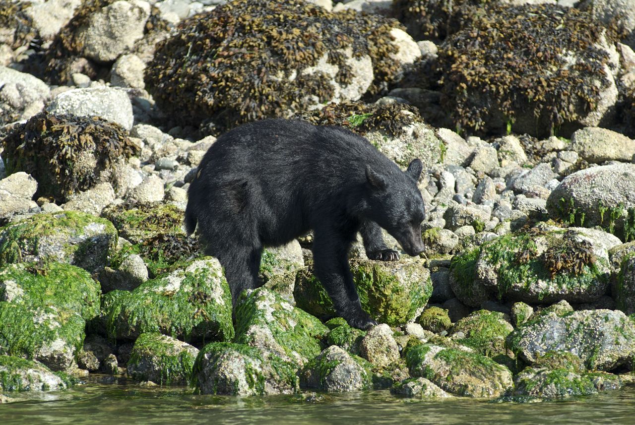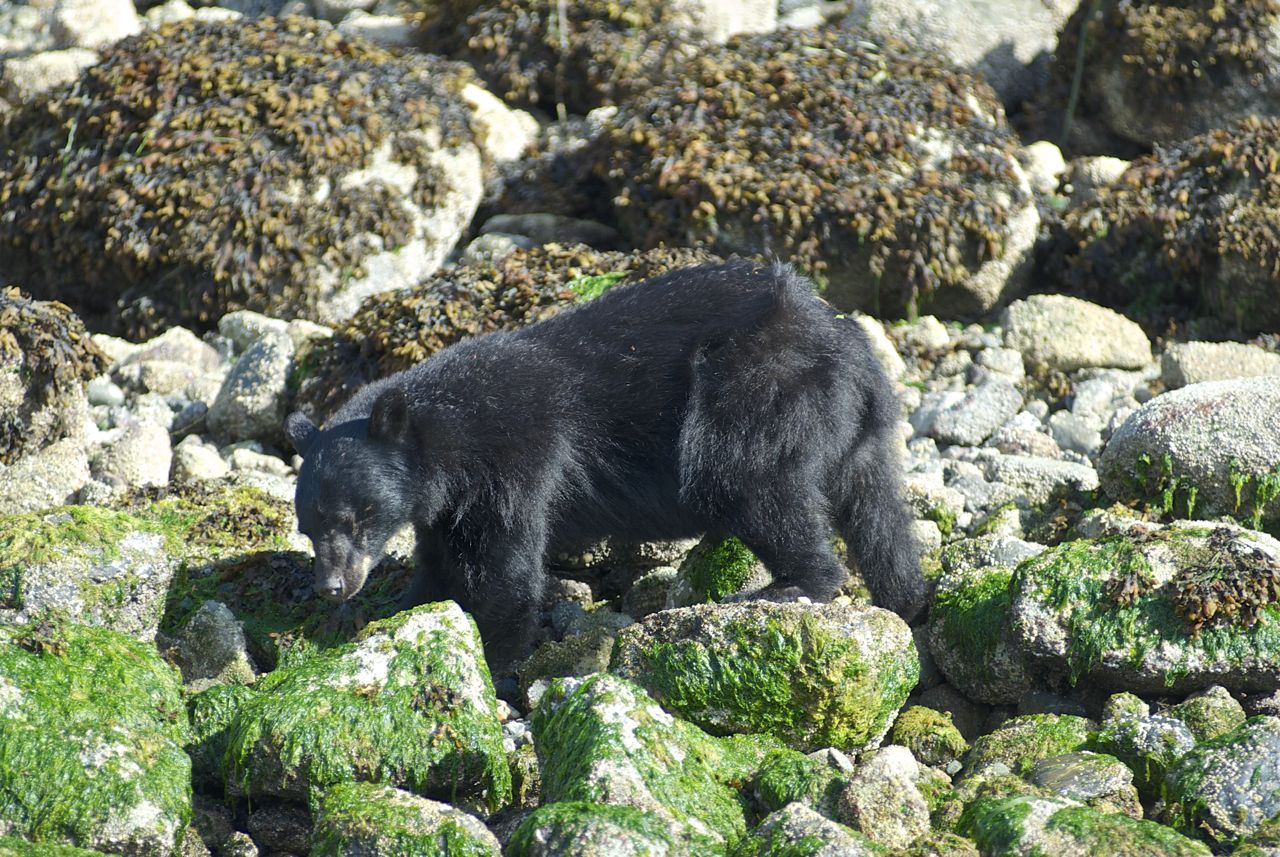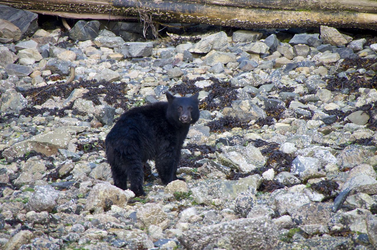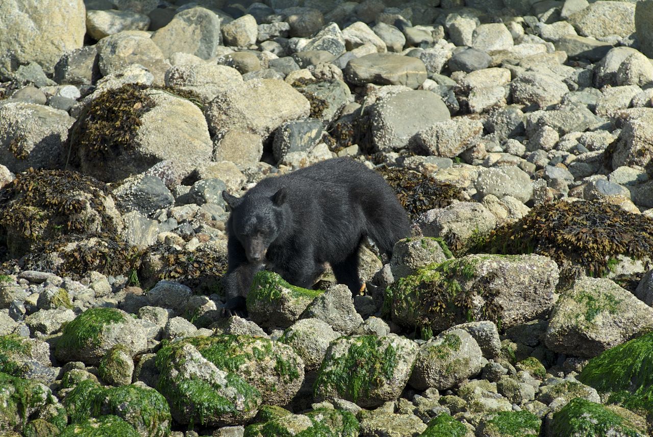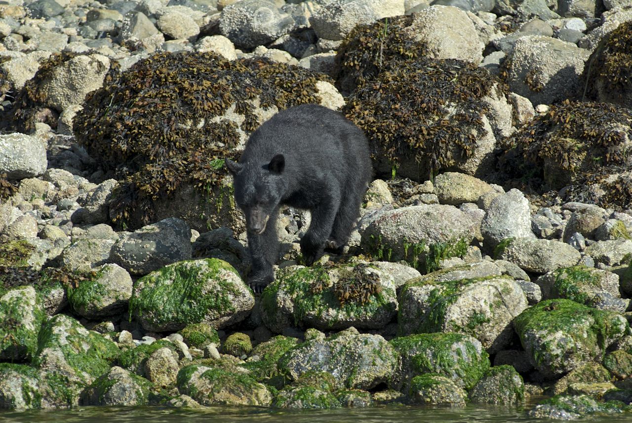 Schwarzbären sind hier in der Gegend recht einfach zu finden. Man brauchte bei Niedrigwasser nur mit dem Boot die Küste entlang zu fahren und nach ihnen Ausschau zu halten. Bei Niedrigwasser verlassen sie nämlich den Wald, wo sie Beeren essen, und kommen an den Strand. Dort drehen sie mit ihren Tatzen mit erstaunlicher Leichtigkeit richtig große Felsbrocken um, um darunter nach Krebsen und anderen Schalentieren zu suchen.