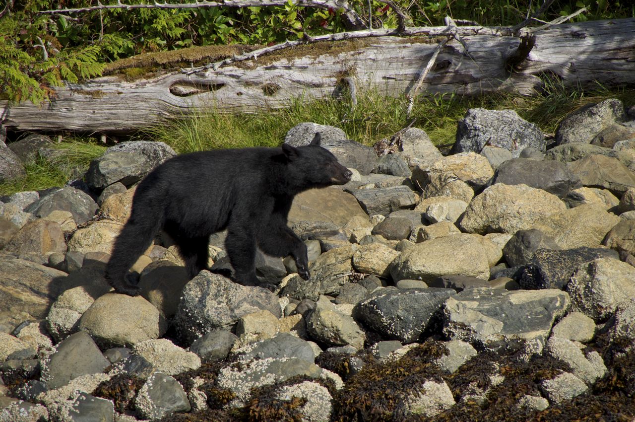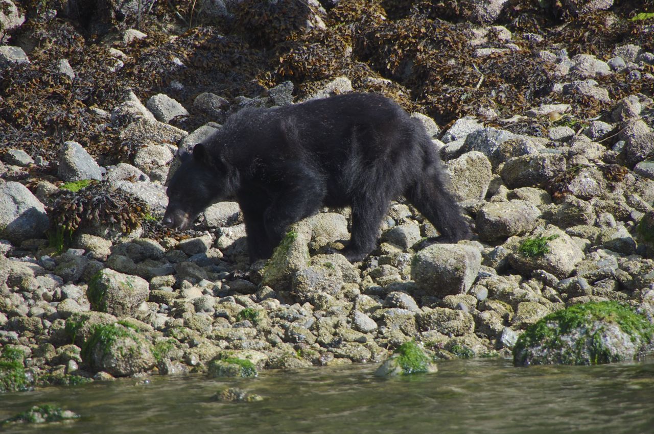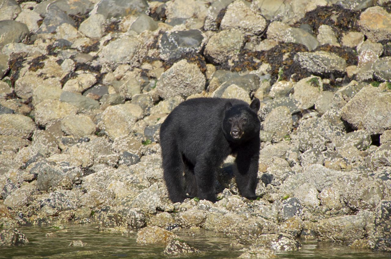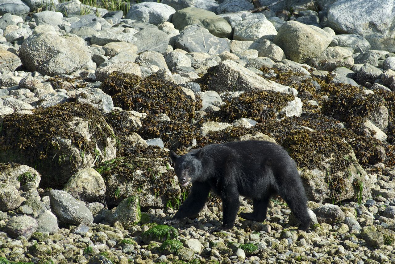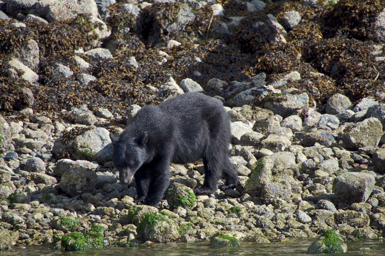 Schwarzbären sind hier in der Gegend recht einfach zu finden. Man brauchte bei Niedrigwasser nur mit dem Boot die Küste entlang zu fahren und nach ihnen Ausschau zu halten. Bei Niedrigwasser verlassen sie nämlich den Wald, wo sie Beeren essen, und kommen an den Strand. Dort drehen sie mit ihren Tatzen mit erstaunlicher Leichtigkeit richtig große Felsbrocken um, um darunter nach Krebsen und anderen Schalentieren zu suchen.