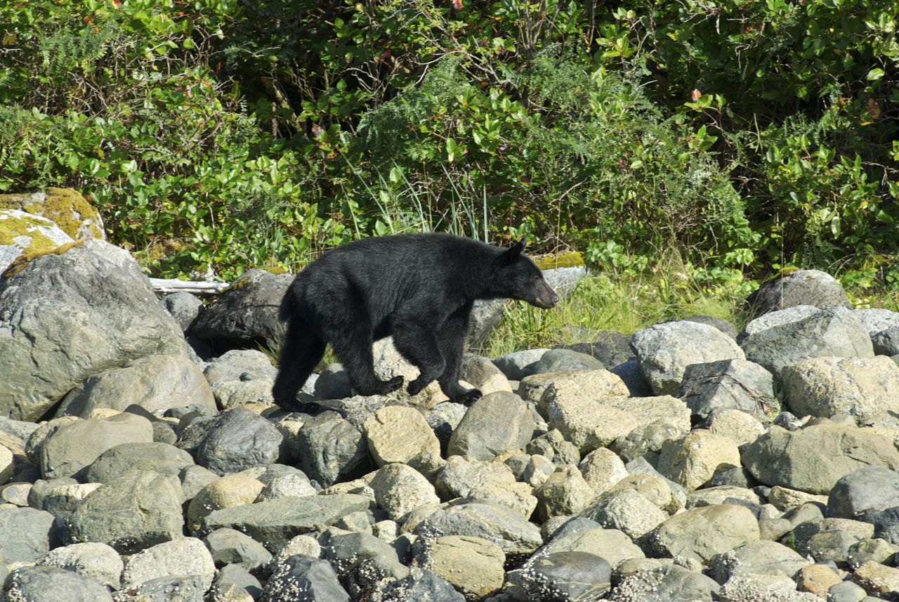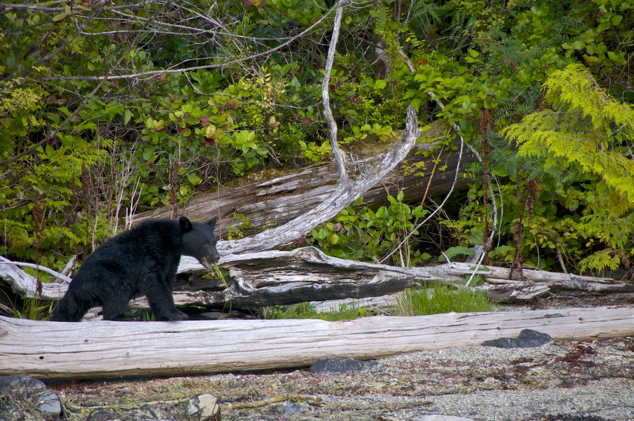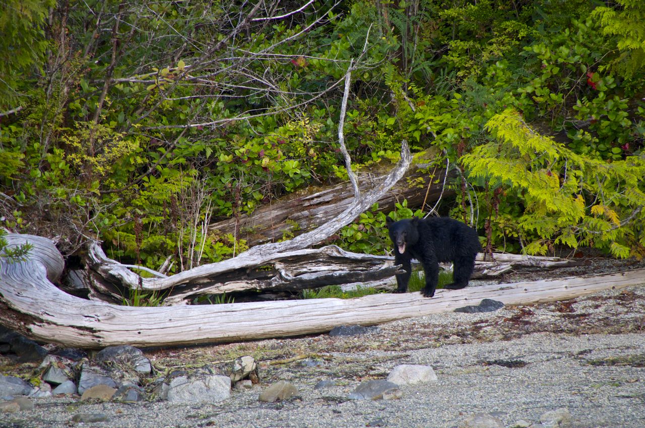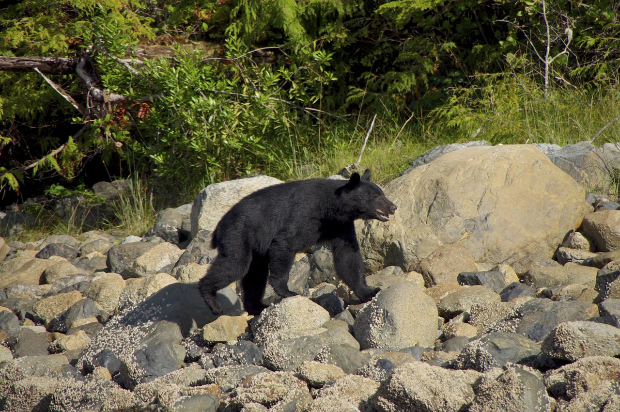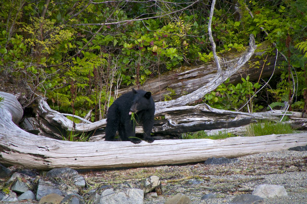 Schwarzbären sind hier in der Gegend recht einfach zu finden. Man brauchte bei Niedrigwasser nur mit dem Boot die Küste entlang zu fahren und nach ihnen Ausschau zu halten. Bei Niedrigwasser verlassen sie nämlich den Wald, wo sie Beeren essen, und kommen an den Strand. Dort drehen sie mit ihren Tatzen mit erstaunlicher Leichtigkeit richtig große Felsbrocken um, um darunter nach Krebsen und anderen Schalentieren zu suchen.