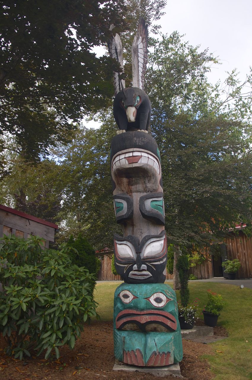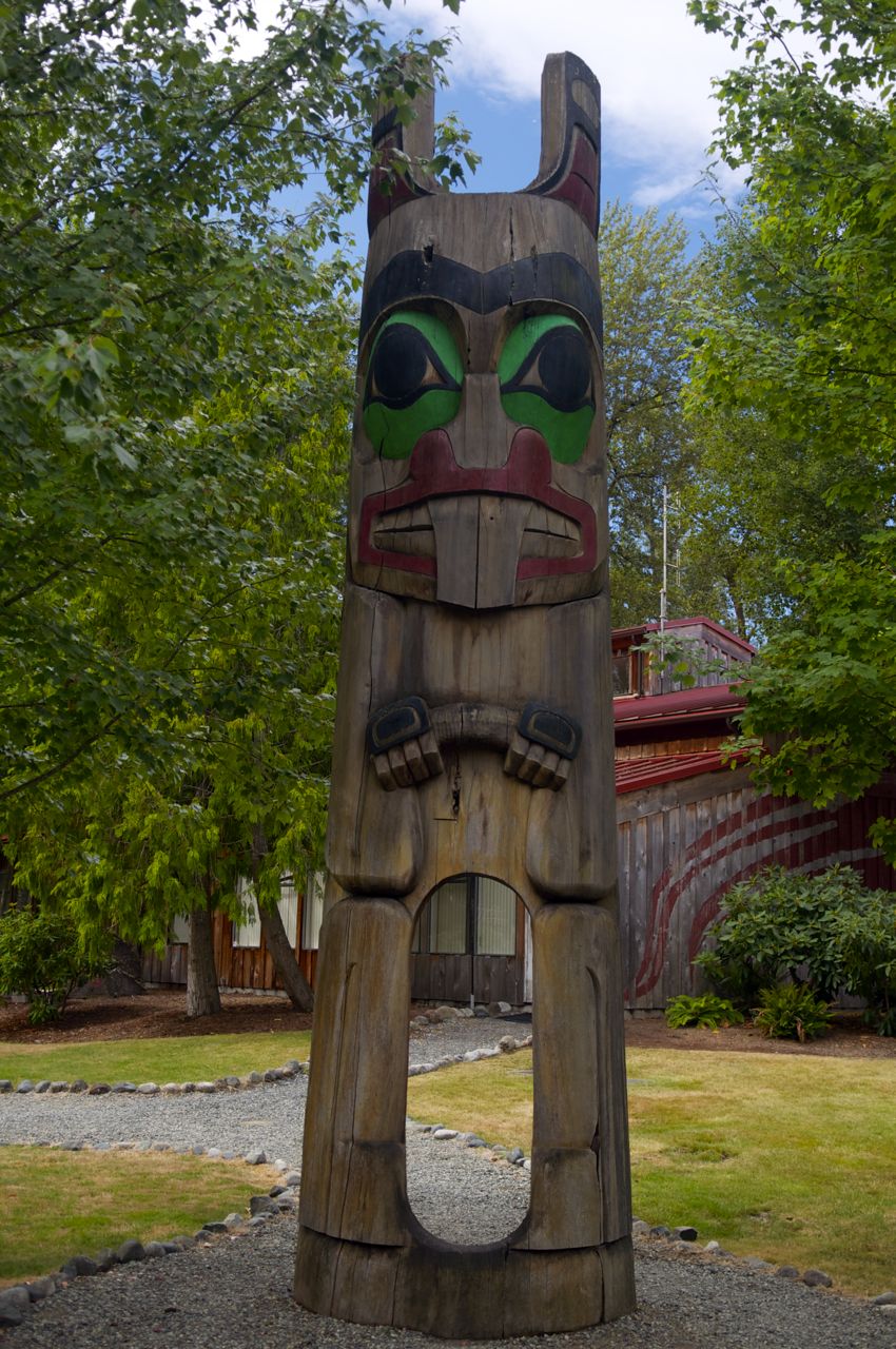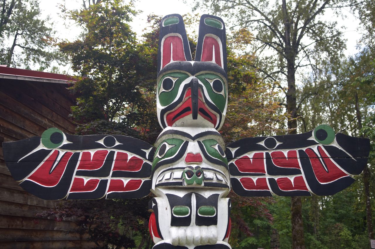 Und in dem Kulturzentrum, in dem wir das gelernt haben, gab es auch unzählige Hauspfähle der First Nations aus dieser Gegend, von denen wir Euch ein paar gerne zeigen: