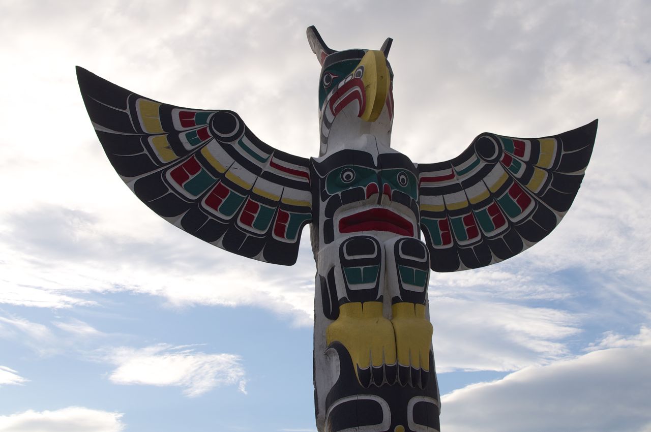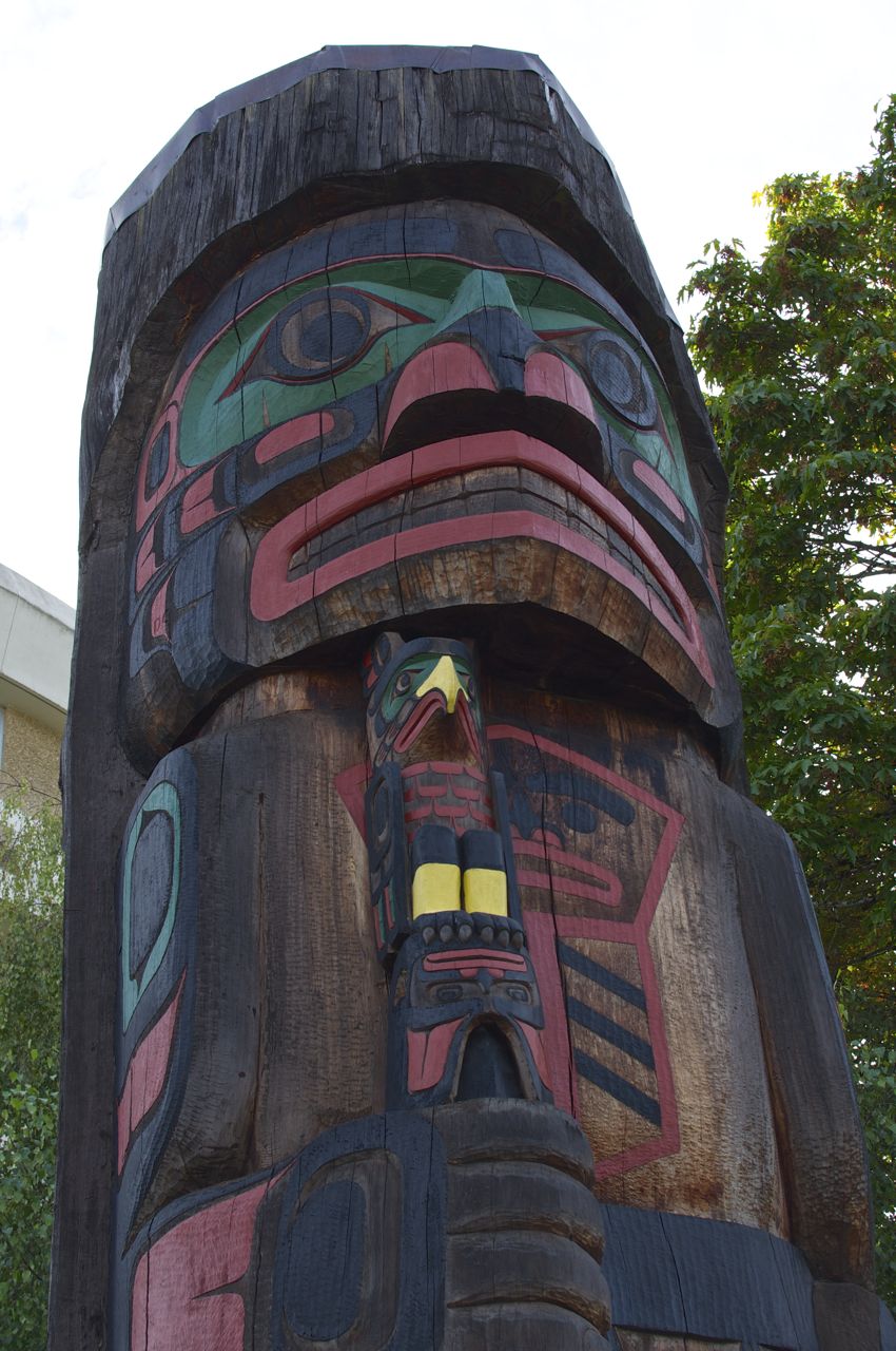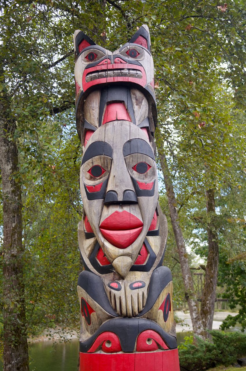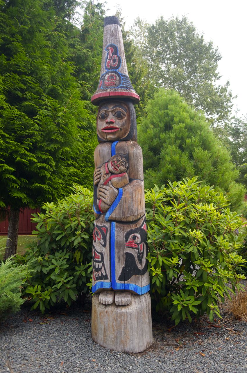 Und in dem Kulturzentrum, in dem wir das gelernt haben, gab es auch unzählige Hauspfähle der First Nations aus dieser Gegend, von denen wir Euch ein paar gerne zeigen: