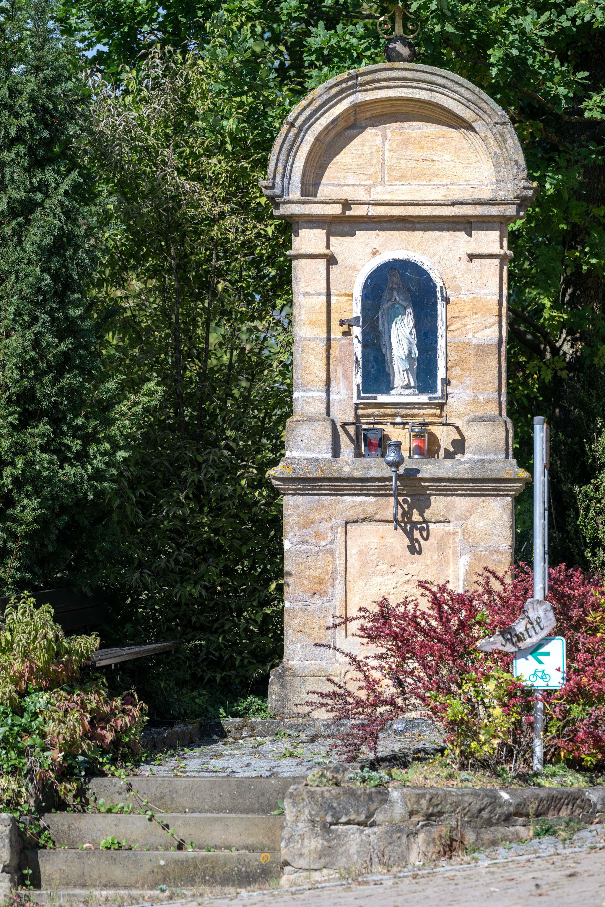 Unmittelbar vor Banz haben wir eine Waldschänke für eine kurze Einkehr mit zwei Johannisbeerschorlen und Blick über das Kloster auf den Staffelberg auf der gegenüberliegenden Talseite genutzt. Überhaupt hatte man regelmäßig Blick auf den Staffelberg und erstaunlich selten Blick auf Vierzehnheiligen.